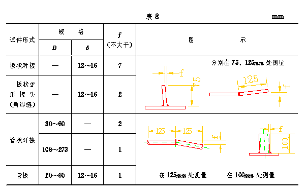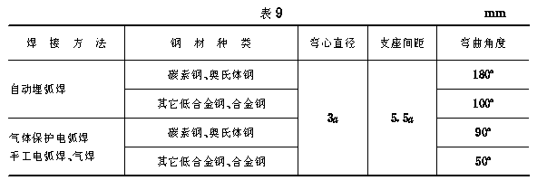 考试合格标准 10.1 操作技能考试合格标准 10.1.1 试件的焊缝经外观检查应符合下列要求: a.焊缝边缘应平缓圆滑过渡到母材,焊缝表面应是原始状态; b.对接试件焊缝几何形状尺寸应符合表6的规定; 对于Ⅰ形对接试件,焊缝直线度不大于2mm,焊缝宽度差不大于3mm不检测每侧增宽。 c.管板试件角焊缝脚K等于δ0+(2/4)mm;板状T形接头(角焊缝)焊脚K等于8±1mm。焊缝表面凸度或凹度均不大于2mm。 d.手工电弧焊、气焊、气体保护电弧焊焊缝表面缺陷应符合表7规定。 e.自动埋弧焊焊缝表面不得有裂纹、末熔合、夹渣、气孔、咬边和焊瘤。 10.1.2 对接试件错边量应小于或等于0.1δ(δ0)但不得大于2mm。 10.1.3 试件焊接角变形应符合表8规定。 10.1.4 焊缝x射线探伤、磁粉探伤,焊缝质量均不低于标准的Ⅱ级。 10.1.5 断口检验应符合下列要求:断口在焊缝金属内,断面上不得有裂纹和未熔合;单个气孔或夹渣的最大长度均应小于或等于1.5mm,相邻两缺陷(气孔或夹渣)间的距离,应超过其中最大缺陷长度的五倍;沿焊缝长度方向10δ0范围内,气孔和夹渣的累计长度小于或等于δ0;沿壁厚方向同一直线上各种缺陷总和小于或等于0.3δ0,且小于或等于1.5mm。当断口位于母材时,试验无效。 10.1.6 通球检验 通球通过试件内孔为合格。 10.1.7 金相宏观检查应符合下列要求:焊缝和热影响区不得有裂纹、未熔合、根部未焊透小于或等于1.5mm;气孔或夹渣不得多于1个,并且小于或等于1.5mm。 10.1.8 焊接接头弯曲试验应符合表9的规定。当试样弯曲到表9规定角度时,其拉伸面上不得有长度大于1.5mm横向(沿试样宽度方向)裂纹;或长度大于3mm的纵向(沿试样长度方向)裂纹。试样四棱角出现的裂纹不计。 如为焊接缺陷所造成的裂纹,应重新取样进行试验。 10.2 基本理论知识考试合格标准,采用100分制,60分为合格。 10.3 操作技能考试和基本理论知识考试均达到合格标准,定为焊工技术考试合格。
