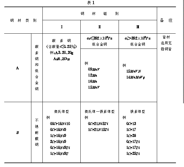 7.1 操作技能考试用钢材分类(见表1) 7.1.1 考试试件的钢材类组别应和焊工所焊产品钢材类组别相同。 7.1.2 表1同类同组中的一种钢号考试合格,可代替该组其它钢号的考试。 7.1.3 表1同类钢材中,Ⅲ组考试合格,可代替Ⅱ、Ⅰ组考试;Ⅱ组考试合格,可代替Ⅰ组考试 7.1.4 焊工所焊产品其钢号不属表1范围,则考试试件的钢号应与产品钢号相同。 7.1.5 对于异种钢号组成的焊接接头,可用高类别或高组别钢号考试代替。 7.2 考试用钢材、焊条、焊丝、焊剂和气体(氩气、乙炔、二氧化碳气体)等的质量,应符合国家标准或部标准的规定,经企业质量检验部门认可合格后方能使用。