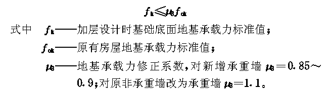 5 改变荷载传递加层法 5.1 设计要求 5.1.1 采用改变荷载传递加层法进行房屋加层时,应对加层后房屋的地基基础、承重结构及其构件进行承载力和正常使用极限状态的验算。其验算结果应满足有关现行国家标准规范的要求,尚应采取可靠的连接措施保证新加层结构与原结构的协同工作。对加层房屋承载轩进行验算时,原房屋的砖砌体,混凝土强度设计值应根据现场实测结果确定。 5.1.2 加层房屋的地基经长期压密,地基的承载力在加层设计时可适当提高;其取值按本规范第4章有关规定确定。对新增加的承重墙,应考虑新旧结构的协调变形及地基上未经压密的情况,其地基承载力应适当折减;对原为非承重墙改为承重墙时,其地基承载力可适当提高,并可按 下式 计算。 5.1.3 新设承重墙的基础宜采用与原房屋相同的基础型式,并尽量与原房屋基础埋深相同。 5.1.4 房屋加层设计时,可根据原房屋的实际情况选用以下方法以改变荷载传递途径: 5.1.4.1 改变原房屋的非承重墙为加层房屋的承重墙。 当原房屋为横墙承重或纵墙承重结构体系时,加层部份可改变为纵墙承重或横墙承重结构体系;当原房屋为纵横墙混合承重结构体系时,加层部分可改变为纵墙承重或横墙承重结构体系。 5.1.4.2 增设新承重墙或柱。 当房屋加层部份的建筑平面需改变,或原房屋承重墙体和基础的承载力与变形不能满足加层荷载下的设计要求时,可增设新承重墙或柱。 5.1.5 原房屋屋面板作为加层后的楼面板时,应该算其承载力和挠度。 5.1.6 原房屋与新加层房屋高差或荷载差异不宜过大;门窗洞宜上下对齐。 5.1.7 原房屋的女儿墙应拆除,不得作为加层房屋的墙体。 5.1.8 在抗震设防区房屋加层设计应满足以下要求: 5.1.8.1 加层后的多层房屋,其总高度和层数、高宽比、抗震横墙间距、局部尺寸限值、构造柱和圈梁的设置等均应符合现行国家标准《建筑抗震设计规范》的有关规定。当不满足要求时,应进行加固设计。 5.1.8.2 对原房屋和加层后的房屋均应按现行国家标准《建筑抗震设计规范》进行抗震设计。 5.1.8.3 加层房屋的砖墙厚度和层高的限值,以及原房屋中未落地的砖墙在计算抗震横墙间距时均应符合本规范第4章的规定。 5.1.8.4 原房屋设有悬挑式踏步板楼梯时,应该本规范第4章的规定进行处理。