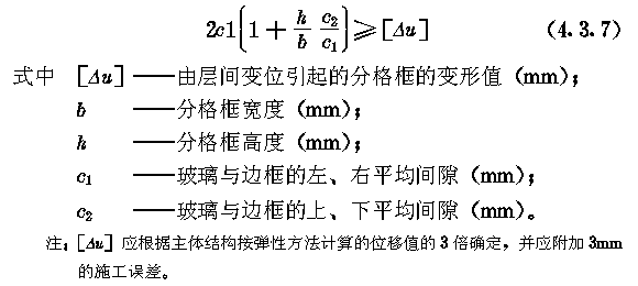 4.3.1.1 玻璃幕墙的立柱与横梁的截面形式宜按等压原理设计; 4.3.1.2 在易发生渗漏的部位应设置流向室外的泄水孔; 4.3.1.3 玻璃幕墙应采用耐候硅酮密封胶进行嵌缝; 4.3.1.4 开启部分的密封材料宜采用氯丁橡胶或硅橡胶制品。 4.3.2 玻璃幕墙在易产生冷凝水的部位,应设置冷凝水排出管道。 4.3.3 玻璃幕墙不同金属材料接触处,应设置绝缘垫片或采取其它防腐蚀措施。 4.3.4 玻璃幕墙的立柱与横梁接触处,应设置柔性垫片。 4.3.5 玻璃幕墙的保温隔热材料,应采用隔气层等措施与室内空间隔开。 4.3.6 隐框玻璃幕墙的玻璃拼缝宽度不宜小于15mm;作为清洗机轨道的玻璃竖缝宽度不宜小于40mm。 4.3.7 明框玻璃幕墙边缘至边框槽底的间隙应满足下式要求: