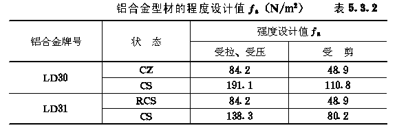 5.3.2 铝合金型材的强度设计值可按表5.3.2采用。