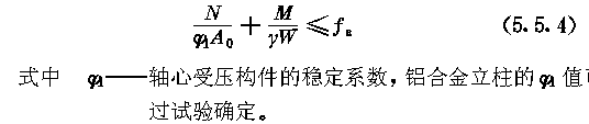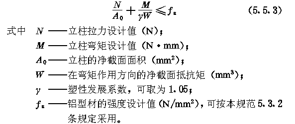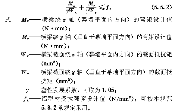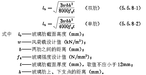5.5.2 玻璃幕墙的横梁截面承载力应符合下式要求: 5.5.3 偏心受拉的玻璃幕墙立柱截面承载力应符合下式要求: 5.5.4 偏心受压的玻璃幕墙立柱截面承载力应符合下式要求: 5.5.5 横梁和立柱的挠度应根据其玻璃幕墙平面外的支承条件,按简支梁或连续梁计算。横梁和立柱的最大挠度应符合下式要求,并且不应大于20mm: u=l/180(5.5.5) 式中u——横梁和立柱的最大挠度(mm); 5.5.6 斜玻璃幕墙应按荷载的实际作用方向计算其截面内力。 5.5.7 横梁和立柱等主要受力构件,其截面受力部分的壁厚不应小于3mm。 5.5.8 全玻幕墙玻璃肋的截面高度lb可按下列公式计算(图5.5.8),并不得小于100mm: 公式 初估玻璃肋截面高度时,也可按附录A进行。 5.5.9 立柱应带有活动接头,接头应通过芯管连接上下柱。上下柱之间应留有空隙,立柱与芯管应为可动配合。上下柱的空隙宽度应考虑温度变化、永久荷载和准永久荷载产生的主体结构轴向变形和加工误差的影响。空隙宽度不宜小于10mm。