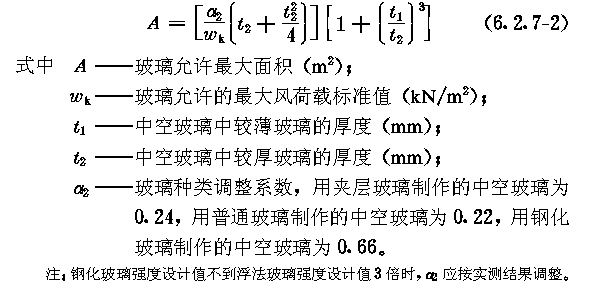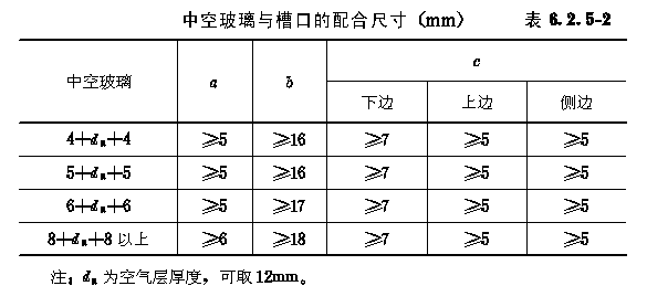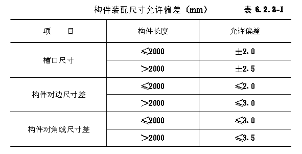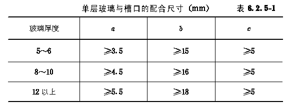 6.2 玻璃幕墙构件加工精度 6.2.1 玻璃幕墙的金属构件的加工精度应符合下列要求: 6.2.1.1 玻璃幕墙结构杆件截料之前应进行校直调整; 6.2.1.2 玻璃幕墙横梁的允许偏差为±0.5mm,立柱的允许偏差为±1.0mm,端头斜度的允许偏差为-15(图6.2.1/1,6.2.1/2); 6.2.1.3 截料端头不应有加工变形,毛刺不应大于0.2mm; 6.2.1.4 孔位的允许偏差为±0.5mm,孔距的允许偏差为±0.5m,累计偏差不应大于±1.0mm; 6.2.1.5 铆钉的通孔尺寸偏差应符合现行国家标准《铆钉用通孔》GB1521的规定; 6.2.1.6 沉头螺钉的沉孔尺寸偏差应符合现行国家标准《沉头螺钉用沉孔》GB1522的规定; 6.2.1.7 圆柱头、螺栓的沉孔尺寸应符合现行国家标准《圆柱头、螺栓用沉孔》GB1523的规定; 6.2.1.8 螺丝孔的加工应符合设计要求。 6.2.2 玻璃幕墙构件中槽、豁、榫的加工应符合下列要求: 6.2.2.1 构件铣槽尺寸允许偏差应符合表6.2.2/1的要求(图6.2.2/1); 6.2.2.2 构件铣豁尺寸允许偏差应符合表6.2.2/2的要求(图6.2.6/2); 6.2.2.3 构件铣榫尺寸允许偏差应符合表6.2.2/3的要求(图6.2.2/3)。 6.2.3 玻璃幕墙构件装配尺寸允许偏差应符合下列要求: 6.2.3.1 构件装配尺寸允许偏差应符合表6.2.3/1的要求; 6.2.3.2 各相邻构件装配间隙及同一平面度的允许偏差应符合表6.2.3/2的要求。 6.2.4 构件的连接应牢固,各构件连接处的缝隙应进行密封处理。 6.2.5 玻璃槽口与玻璃或保温板的配合尺寸应符合下列要求: 6.2.5.1 单层玻璃与槽口的配合尺寸应符合表6.2.5/1的要求(图6.2.5/1); 6.2.5.2 中空玻璃与槽口的配合尺寸应符合表6.2.5/2的要求(图6.2.5/2)。 6.2.6 全玻幕墙的加工组装应符合下列要求: 6.2.6.1 玻璃边缘应进行处理,其加工精度应符合设计的要求; 6.2.6.2 高度超过4m的玻璃应悬挂在主体结构上; 6.2.6.3 玻璃与玻璃、玻璃与玻璃肋之间的缝隙,应采用结构硅酮密封胶嵌填严密。 6.2.7 玻璃幕墙加工制作时,玻璃的最大面积可按下列公式计算。 6.2.7.1 单片玻璃:公式 6.2.7.2 中空玻璃:公式 6.2.8 玻璃幕墙与建筑主体结构连接的固定支座材料宜选用铝合金、不锈钢或表面热镀锌处理的碳素结构钢,并应具备调整范围,其调整尺寸ax、ay、az不应小于40mm(图6.2.8)。