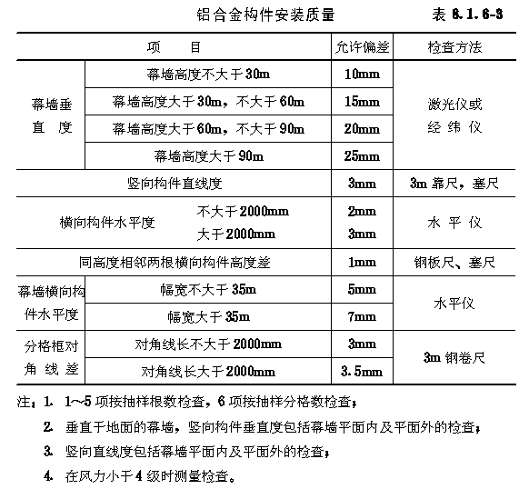 8.1.2 玻璃幕墙验收时应提交下列资料: (1)设计图纸、文件、设计修改和材料代用文件; (2)材料出厂质量证书,结构硅酮密封胶相容性试验报告及幕墙物理性能检验报告; (3)预制构件出厂质量证书; (4)隐蔽工程验收文件; (5)施工安装自检记录。 8.1.3 玻璃幕墙工程验收时,应按本规范第7.3.10条的要求进行隐蔽验收。 8.1.4 玻璃幕墙工程质量检验应进行观感检验和抽样检验。并应以一幅玻璃幕墙为检验单元,每幅玻璃幕墙均应检验。 8.1.5 玻璃幕墙观感检验应符合下列要求: 8.1.5.1 明框幕墙框料应竖直横平;单元式幕墙的单元拼缝或隐框幕墙分格玻璃拼缝应竖直横平,缝宽应均匀,并符合设计要求; 8.1.5.2 玻璃的品种、规格与色彩应与设计相符,整幅幕墙玻璃的色泽应均匀;不应有析碱、发霉和镀膜脱落等现象; 8.1.5.3 玻璃的安装方向应正确; 8.1.5.4 幕墙材料的色彩应与设计相符,并应均匀,铝合金料不应有脱膜现象; 8.1.5.5 装饰压板表面应平整,不应有肉眼可察觉的变形、波纹或局部压砸等缺陷; 8.1.5.6 幕墙的上下边及侧边封口、沉降缝、伸缩缝、防震缝的处理及防雷体系应符合设计要求; 8.1.5.7 幕墙隐蔽节点的遮封装修应整齐美观; 8.1.5.8 幕墙不得渗漏; 8.1.6 玻璃幕墙工程抽样检验应符合下列要求: 8.1.6.1 铝合金料及玻璃表面不应有铝屑、毛刺、油斑和其他污垢; 8.1.6.2 玻璃应安装或粘结牢固,橡胶条和密封胶应镶嵌密实、填充平整; 8.1.6.3 钢化玻璃表面不得有伤痕; 8.1.6.4 每平方米玻璃的表面质量符合表8.1.6/1的规定; 8.1.6.5 一个分格铝合金料表面质量应符合表8.1.6/2的规定; 8.1.6.6 铝合金框架构件安装质量应符合表8.1.6/3的规定; 8.1.6.7 隐框玻璃幕墙的安装质量应符合表8.1.6/4的规定。 8.1.7 玻璃幕墙工程抽样检验数量,每幅幕墙的竖向构件或竖向拼缝和横向构件或横向拼缝应各抽查5%,并均不得少于3根;每幅幕墙分格应各抽查5%,并不得少于10个,所抽检质量均应符合本规范8.1.6的规定。 注:1.抽样的样品,1根竖向构件或竖向拼缝指该幅幕墙全高的1根构件或拼缝;1根横向构件或横向拼缝指该幅幕墙全宽的1根构件或拼缝。 2.凡幕墙上的开启部分,其抽样检验的工程验收按现行行业标准《建筑装饰工程施工及验收规范》(JGJ73)