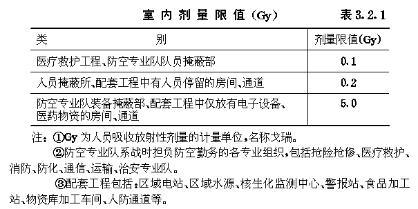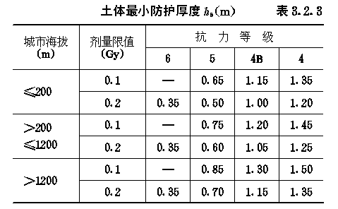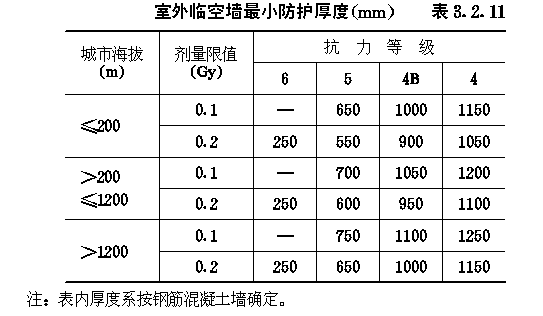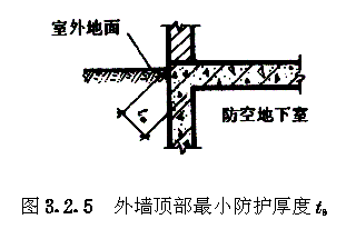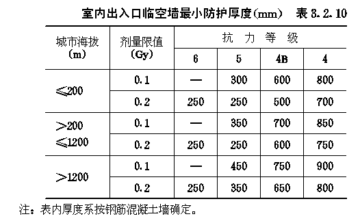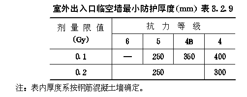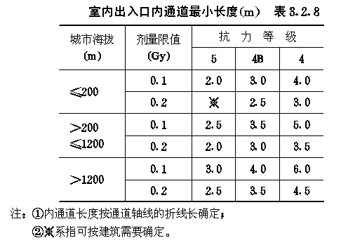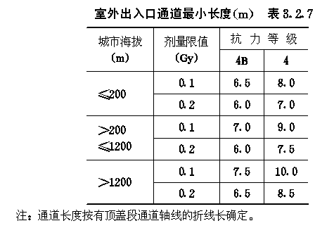 3.2 早期核辐射的防护 3.2.1 防空地下室室内早期核辐射剂量的设计限值(以下简称剂量限值)应满足表3.2.1的要求。 3.2.2 4级及以下的防空地下室,其室内剂量限值为5.0Gy的房间或通道可不进行防早期核辐射验算。 3.2.3 防空地下室顶板上面覆土的最小厚度,应满足下式要求: ht≥hs-ζzd1(3.2.3) 式中:ht——覆土最小厚度(m); 3.2.4 当防空地下室上方设有管道层或普通地下室,且满足下列各项要求时,其顶板上面可不覆土: 3.2.4.1 管道层或普通地下室的外墙,战时没有门窗等孔口; 3.2.4.2 管道层或普通地下室的顶板最小厚度应满足下式要求: dg=(hs-ζz1d1)/ζzg (3.2.4-1) 式中:dg——顶板最小厚度,对空心楼板系指折算成实心的厚度(m); 3.2.4.3 高出室外地面的管道层或普通地下室外墙的最小厚度,应满足下式要求: dq=(hs-ζz1d1)/ζzq (3.2.4-2) 式中:dq——外墙最小厚度(m); 3.2.5 全埋式防空地下室外墙顶部应采用钢筋混凝土,其最小防护厚度ts应满足表3.2.5的要求(图3.2.5)。 外墙顶部最小防护厚度t(m)表3.2.5 3.2.6 非全埋式的6级防空地下室,其室外地面以上的钢筋混凝土外墙厚度不应小于250mm。 3.2.7 5级及以上的防空地下室,其阶梯式、坡道式室外出入口不宜采用直通式。6级防空地下室,其通道长度可按建筑需要确定。5级防空地下室,当通道具有一个90°拐弯时,其通道长度可按建筑需要确定。4级和4B级防空地下室,当通道具有一个90°拐弯,且通道净宽不大于2m时,其通道最小长度应满足表3.2.7的要求;当通道净宽大于2m时,其通道最小长度应乘以修正系数ζx,其值可按下式计算: ζx=0.8bT-0.6 (3.2.7) 式中:ζx——通道长度修正系数; 室外出入口通道最小长度(m)表3.2.7 3.2.8 5级及以上的防空地下室,其室内出入口不宜采用无拐弯形式。当室内出入口具有一个90°拐弯时,自防护密闭门至最后道密闭门之间的通道(亦称内通道)最小长度,应满足表3.2.8的要求(图3.2.8)。 室内出入口内通道最小长度(m)表3.2.8 3.2.9 符合第3.2.7条要求的室外出入口,其临空墙最小防护厚度应满足表3.2.9的要求。 图3.2.8室内出入口作法有无拐弯示意 室外出入口临空墙最小防护厚度(mm)表3.2.9 3.2.10 室内出入口临空墙最小防护厚度应满足表3.2.10的要求。 3.2.11 附壁式室外出入口,其临空墙的最小防护厚度应满足表3.2.11的要求(图3.2.11)。 室内出入口临空墙最小防护厚度(mm)表3.2.10 室外临空墙最小防护厚度(mm)表3.2.11 3.2.12 当钢筋混凝土临空墙厚度不能满足最小防护厚度要求时,可按下列方法之一进行处理: 3.2.12.1 采用砌砖加厚墙体。复合墙的总折算厚度不应小于最小防护厚度。其总折算厚度可按下式计算: dto=dc+0.7dbr (3.2.12) 式中:dto——复合墙总折算厚度(mm); 3.2.12.2 临空墙内侧的房间,战时不得作为人员工作或掩蔽使用。 图3.2.11附壁式室外出入口