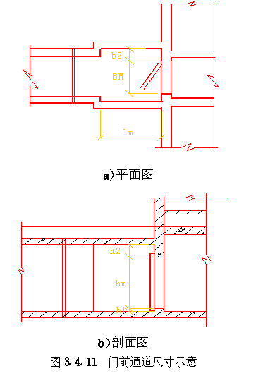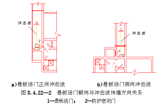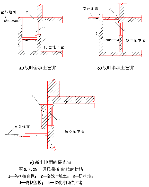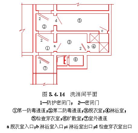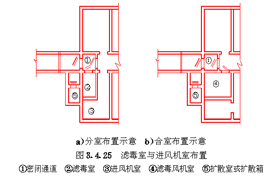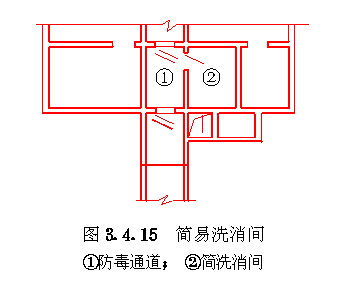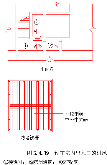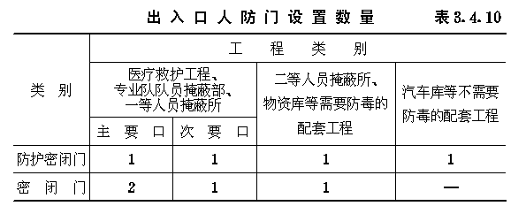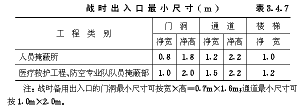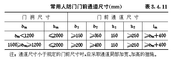 3.4 口部设计 3.4.1 防空地下室出入口的设置应符合以下要求: 3.4.1.1 防空地下室的每个防护单元不应少于两个出入口(不包括防护单元之间的连通口),其战时使用的主要出入口应设在室外,且不应采用竖井式。 3.4.1.2 消防车库、大型物资库应分别设置两个室外出入口,中心医院、急救医院宜分别设置两个室外出入口,并宜设置在不同方向和保持最大距离处。 3.4.1.3 人员掩蔽所中相邻的两个防护单元,可在防护密闭门外共设一个室外出入口。相邻防护单元的防地面超压不同时,共设的室外出入口应按高抗力等级设计。 3.4.1.4 室外出入口设计应采取防止地面雨水倒灌措施。 3.4.2 室外出入口通道敞开段(无顶盖段),宜布置在地面建筑的倒塌范围以外,地面建筑的倒塌范围可按表3.4.2采用。 地面建筑倒塌范围表3.4.2 3.4.3 防空地下室室外出入口的口部建筑应满足以下要求: 3.4.3.1 在倒塌范围以外的室外出入口口部建筑宜采用单层轻型建筑。 3.4.3.2 因受条件限制,室外出入口通道敞开段设置在地面建筑倒塌范围以内时,其口部建筑应采用防倒塌棚架。 3.4.4 备用出入口可采用竖井式,且宜与通风竖井合并设置。竖井的平面净尺寸不宜小于1.0m×1.0m。当竖井设在地面建筑倒塌范围以内时,其高出室外地面部分应采取防倒塌措施。 3.4.5 防空地下室的平时功能与上部建筑无关时,其平时使用的室内出入口宜与上部建筑的出入口分开设置。 3.4.6 当电梯由地面通至地下室时,电梯必须设置在防空地下室的防护密闭区以外。 3.4.7 出入口通道、楼梯和门洞尺寸应根据战时及平时的使用要求,以及防护密闭门、密闭门的尺寸确定。防空地下室战时出入口的最小尺寸应符合表3.4.7的规定。 战时出入口最小尺寸(m)表3.4.7 3.4.8 人员掩蔽所战时出入口的门洞净宽之和,应按掩蔽人数每100人不小于0.375m计算。每樘门的通过人数不应超过500人,出入口通道和楼梯的净宽不应小于该门洞的净宽。注:门洞净宽之和不包括竖井式出入口、连通口和防护单元之间连通口。 3.4.9 人员掩蔽所的战时阶梯式出入口应满足下列要求: 3.4.9.1 每个梯段的踏步不应超过18级,且不应少于3级; 3.4.9.2 踏步高不宜大于180mm,宽不宜小于250mm,且不应采用扇形踏步; 3.4.9.3 楼梯应至少在一侧设扶手,楼梯净宽达2m时应在两侧设扶手,宽度大于2.5m时应加设中间扶手。 3.4.10 防空地下室出入口人防门的设置数量应符合表3.4.10的规定,并按由外到内的顺序,设置防护密闭门、密闭门。防护密闭门应向外开启,密闭门宜向外开启。 出入口人防门设置数量表3.4.10 3.4.11 防护密闭门和密闭门的门前通道,其净宽和净高应满足门扇的开启和安装要求。常用防护密闭门、密闭门门前通道尺寸可按表3.4.11采用(图3.4.11)。 3.4.12 防空地下室的战时主要出入口,应按下列规定设置防毒通道、洗消间或简易洗消间。 3.4.12.1 医疗救护工程、专业队队员掩蔽部和一等人员掩蔽所应设两道防毒通道和洗消间; 3.4.12.2 二等人员掩蔽所和战时室外染毒情况下有人员出入的配套工程,应设一道防毒通道和简易洗消间。 常用人防门门前通道尺寸(mm)表3.4.11 图3.4.11门前通道尺寸示意 3.4.13 防毒通道应由防护密闭门或密闭门或密闭门与密闭门之间的通道组成,并应在通道内设置能满足换气次数要求的通风换气设备。在满足使用要求的前提下宜缩小通道容积。 3.4.14 洗消间的设置应符合以下要求: 3.4.14.1 洗消间应设置在防毒通道的一侧(图3.4.14)。 3.4.14.2 洗消间应由脱衣室、淋浴室和检查穿衣室组成。脱衣室的入口应设置在第一防毒通道内;淋浴室的入口应设置一道密闭门;检查穿衣室的出口应设置在第二防毒通道内。 3.4.14.3 医疗救护工程的脱衣室、淋浴室和检查穿衣室的使用面积均宜按每一淋浴器6m2计;其它工程的脱衣室、检查穿衣室的使用面积均宜按每一淋浴器3m2计;淋浴室的使用面积宜按每一淋浴器2m2计。 3.4.14.4 淋浴器的布置应避免洗消人员足迹交叉。 3.4.14.5 淋浴器数量可按本规范第6.3.1条确定。 图3.4.14洗消间平面 3.4.15 简易洗消间宜在防毒通道的一侧单独设置,其使用面积宜为5~10m2(图3.4.15)。亦可与适当加宽的防毒通道合并设置。 图3.4.15简易洗消间 3.4.16 在医疗救护工程的洗消间入口前,应设置伤员检查分类厅,并宜设置急救床位、厕所和染毒衣物存放位置。 3.4.17 防空地下室战时主要出入口防护密闭门外的通道内,应设置洗消污水集水坑。 3.4.18 进风口、排风口宜在室外单独设置。供战时使用的和平战两用的进风口、排风口应采取防倒塌、防堵塞措施。专供平时使用的进风口、排风口应按本规范第4.8节要求采取确保防空地下室战时防护安全的转换措施。 3.4.19 设洗消间或简易洗消间的防空地下室,其战时排风口应设在室外主要出入口。当只有一个室外出入口时,战时进风口宜在室外单独设置。5级和6级防空地下室,当室外确无单独设置进风口条件时,进风口可结合室内出入口设置,但在防爆波活门外侧应采取防堵塞措施(图3.4.19)。 3.4.20 不设洗消间和简易洗消间的防空地下室,当只有一个室外出入口时,其战时进风口宜结合室外出入口设置;战时排风宜通过厕所排出。 3.4.21 进风口、排风口、排烟口的防爆波活门、扩散室和扩散箱等消波设施,应按本规范第4.9节要求设置。常用消波设施可按表3.4.21采用。 图3.4.19设在室内出入口的进风口防堵塞措施 常