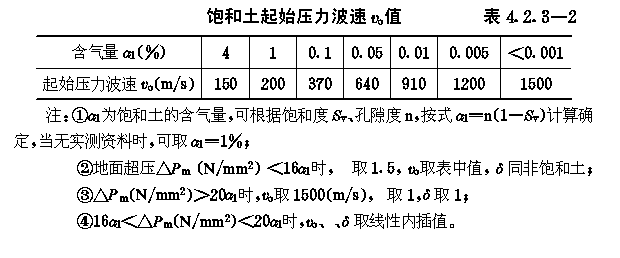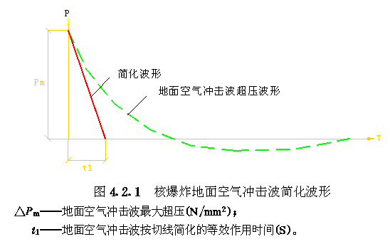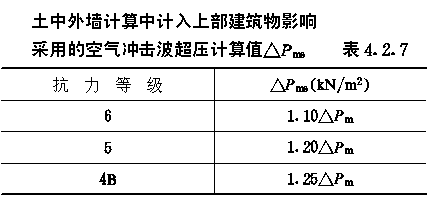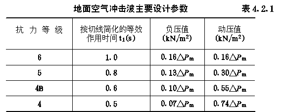 4.2 核爆炸地面空气冲击波、土中压缩波参数 4.2.1 在结构计算中,核爆炸地面空气冲击波超压波形,可取在峰值压力处按切线简化的无升压时间的三角形(图4.2.1)。 图4.2.1核爆炸地面空气冲击波简化波形 防空地下室设计采用的地面空气冲击波最大超压值(简称地面超压)△Pm,应按国家现行有关规定确定。地面空气冲击波的其它主要设计参数可按表4.2.1采用。 地面空气冲击波主要设计参数表4.2.1 4.2.2 在结构计算中,土中压缩波压力波形可取简化为有升压时间的平台形(图4.2.2)。 4.2.3 土中压缩波的最大压力Ph及土中压缩波升压时间toh可按下列公式确定:公式 式中:Ph——土中压缩波的最大压力(kN/m2),当土的计算深度小于或等于1.5m时,Ph可近似取△Pms; 图4.2.2土中压缩波简化波形 Ph——土中压缩波最大压力(KN/m2)。 非饱和土υo、、δ值表4.2.3-1 饱和土起始压力波速υo值表4.2.3-2 地面空气冲击波按等冲量简化的等效作用时间t2值表4.2.3-3 4.2.4 在结构顶板计算中,对5级和6级防空地下室,当符合下列条件之一时,可计入上部建筑物对地面空气冲击波超压作用的影响。 4.2.4.1 上部建筑物层数不少于二层,其底层外墙为不低于240mm砖砌体强度的墙体,且任何一面外墙墙面开孔面积不大于该墙面面积的50%。 4.2.4.2 上部为单层建筑物,其承重外墙使用的材料和开孔比例符合上款规定,且屋顶为钢筋混凝土结构。 4.2.5 对符合本规范第4.2.4条规定的6级防空地下室,作用在其上部建筑物底层地面的空气冲击波超压波形可采用有升压时间平台形(图4.2.2),空气冲击波超压计算值可取△Pm,升压时间可取0.025s。 4.2.6 对符合本规范第4.2.4条规定的5级防空地下室,作用在其上部建筑物底层地面的空气冲击波超压波形可采用有升压时间的平台形(图4.2.2),空气冲击波超压计算值可取0.95△Pm,升压时间可取0.025s。 4.2.7 在计算土中外墙核爆动荷载时,对4B级及以下的防空地下室,当上部建筑物的外墙为钢筋混凝土承重墙,或对上部建筑物为抗震设防的砌体结构或框架结构的6级防空地下室,均应计入上部建筑物对地面空气冲击波超压值的影响,空气冲击波超压计算值△Pms应按表4.2.7的规定采用。 土中外墙计算中计入上部建筑物影响采用的空气冲击波超压计算值△Pms表4.2.7
