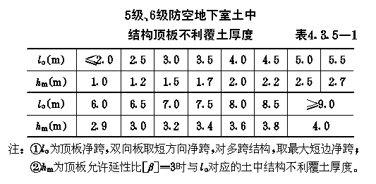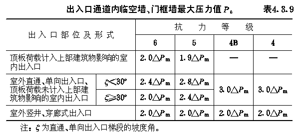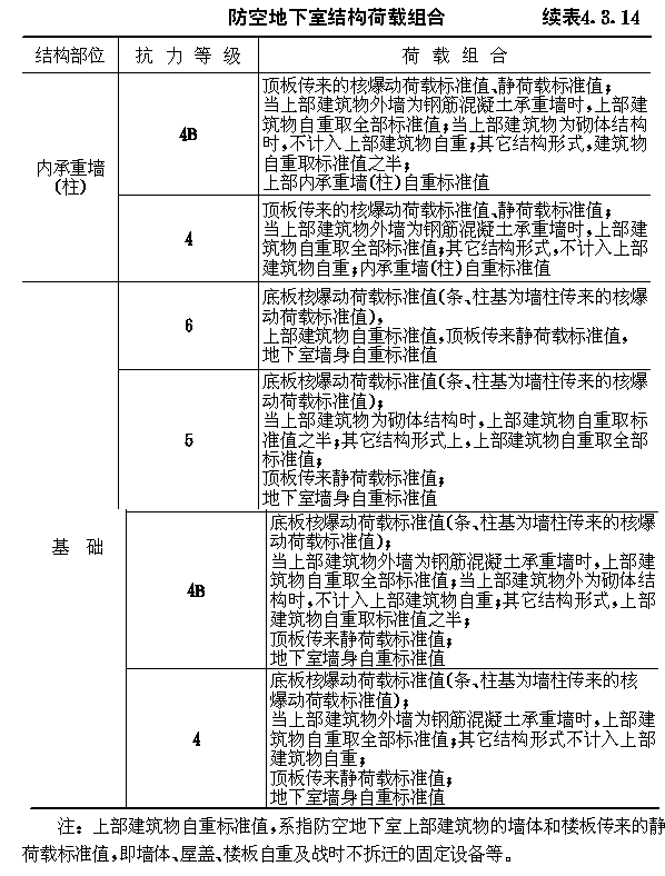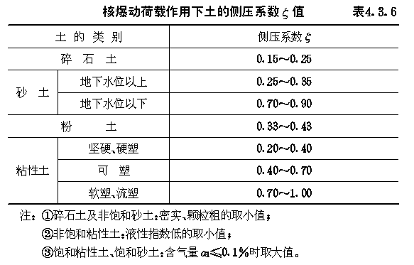 4.3 荷载及荷载组合 4.3.1 作用在防空地下室结构上的荷载,应包括核爆动荷载、上部建筑物自重、土压力、水压力及防空地下室自重等。对核爆动荷载,设计时采用一次作用。 4.3.2 全埋式防空地下室结构上的核爆动荷载,可按同时均匀作用在结构各部位设计(图4.3.2-a)。 当6级防空地下室顶板底面高出室外地面时,尚应验算地面空气冲击波对高出地面外墙的单向作用(图4.3.2-b)。 图4.3.2结构周边核爆动荷载作用方式 4.3.3 防空地下室结构顶板的核爆动荷载最大压力Pc1及升压时间toh可按下列公式计算。 4.3.3.1 顶板计算中不计入上部建筑物影响的防空地下室: Pc1=KPh (4.3.3-1) toh=(γ-1)(h/υo) (4.3.3-2) 式中:Pc1——防空地下室结构顶板的核爆动荷载最大压力(kN/m2); 4.3.3.2 顶板计算中计入上部建筑物影响的防空地下室: Pc1=KPh (4.3.3-3) toh=0.025+(γ-1)(h/υo) (4.3.3-4) 4.3.4 结构顶板核爆动荷载综合反射系数K可按下列规定确定。 4.3.4.1 覆土厚度h为0时,K=1.0; 4.3.4.2 覆土厚度h大于或等于结构不利覆土厚度hm时,非饱和土的K值可按表4.3.4确定,饱和土的K值可按下列规定确定: (1)当△Pm(N/mm2)>20α1时,平顶结构K=2.0,非平顶结构K=1.8; (2)当△Pm(N/mm2)<16α1时,K值按非饱和土确定; (3)当16α1≤△Pm(N/mm2)≤20α1时,K值可按线性内插确定。 4.3.4.3 结构顶板覆土厚度h小于结构不利覆土厚度hm时,K值可按线性内插确定。对主体结构,当结构顶板覆土厚度h不大于0.5m时,综合反射系数K值可取1.0。 h≥hm时非饱和土的综合反射系数K值表4.3.4 4.3.5 土中结构顶板的不利覆土厚度hm,可按表4.3.5-1、表4.3.5-2采用。 5级、6级防空地下室土中结构顶板不利覆土厚度表4.3.5-1 4.3.6 土中结构外墙上的水平均布核爆动荷载的最大压力Pc2及升压时间toh可按下列公式计算: Pc2=ζPh (4.3.6-1) tQh=(γ-1)(h/υo) (4.3.6-2) 式中:Pc2——土中结构外墙上的水平均布核爆动荷载的最大压力(kN/m2); 4级、4B级防空地下室土中结构顶板不利覆土厚度表4.3.5-2 核爆动荷载作用下土的侧压系数ζ值表4.3.6 4.3.7 当6级防空地下室的顶板底面按本规范第3.3.7条规定高出地面,直接承受空气冲击波作用的外墙最大水平均布压力Pc2′可取2Pm。 4.3.8 结构底板上核爆动荷载最大压力可按下式计算: Pc3=ηPc1 (4.3.8) 式中:Pc3——结构底板上核爆动荷载最大压力(kN/m2); 4.3.9 作用在防空地下室出入口通道内临空墙、门框墙的最大压力值Pc,可按表4.3.9取值。 出入口通道内临空墙、门框墙最大压力值Pc表4.3.9 4.3.10 防空地下室出入口通道内防护密闭门及防爆波活门,应按表4.3.10的规定选用定型产品。相邻两防护单元之间防护密闭门,应按表4.5.8-1及4.5.8-2的规定选用定型产品。 出入口通道内防护密闭门及防爆波活门设计压力选用值表4.3.10 4.3.11 防空地下室的室内出入口,除临空墙外,其它与防空地下室无关的墙、楼梯踏步和休息平台等均不计入核爆动荷载作用。 4.3.12 防空地下室室外出入口土中通道结构上的核爆动荷载,可按下列规定采用。 4.3.12.1 有顶板的通道结构,按承受土中压缩波产生的核爆动荷载计算,其值可按本规范4.3.3~4.3.6条及第4.3.8条确定。 4.3.12.2 无顶板敞开段通道结构,可不验算核爆动荷载作用。 4.3.12.3 土中竖井结构,无论有无顶板,均按由土中压缩波产生的法向均布动荷载计算,其值可按本规范第4.3.6条的规定确定。 4.3.13 作用在扩散室与防空地下室内部房间相邻的隔墙上最大压力,可按消波系统的余压确定。扩散室与土直接接触的外墙、顶板及底板均可按外部核爆动荷载计算。 4.3.14 防空地下室结构的荷载组合,可按表4.3.14的规定确定。 防空地下室结构荷载组合表4.3.14-1 防空地下室结构荷载组合表4.3.14-2