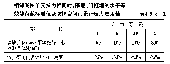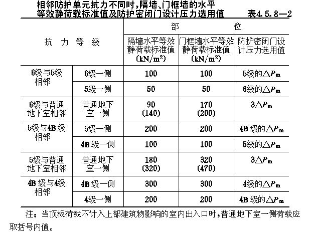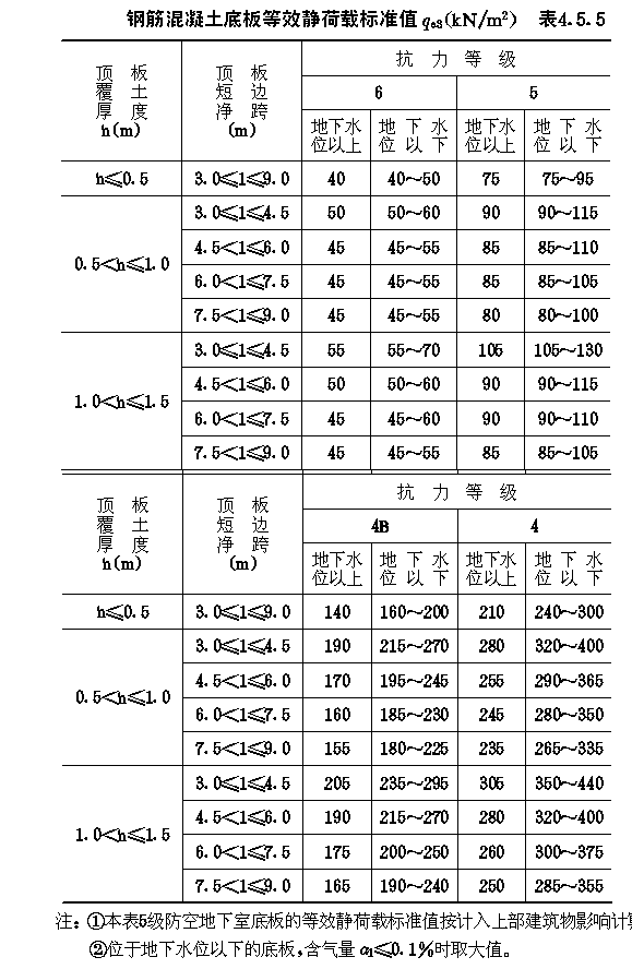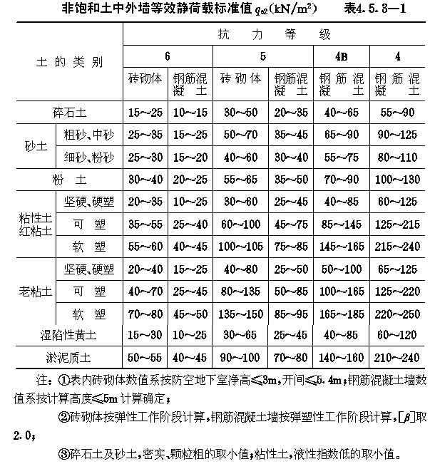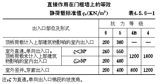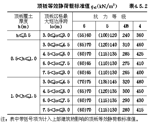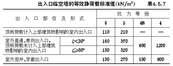 4.5 常用结构等效静荷载标准值 4.5.1 作用在防空地下室结构各部位的等效静荷载标准值,除可按本规范4.2~4.4节的公式计算外,当条件符合时,也可按本节的表格直接选用。 4.5.2 当防空地下室的顶板为钢筋混凝土梁板结构,且按允许延性比[β]等于3计算时,顶板的等效静荷载标准值qe1可按表4.5.2采用。 顶板等效静荷载标准值qe1(kN/m2)表4.5.2 4.5.3 防空地下室土中外墙的等效静荷载标准值qe2,当未计入上部建筑物对外墙影响时,可按表4.5.3-1、4.5.3-2采用;当按本规范第4.2.7条的规定应计入上部建筑物影响时,土中外墙的等效静荷载标准值qe2应按表4.5.3-1、4.5.3-2规定数值乘以系数λ采用。6级时,λ=1.1;5级时,λ=1.2;4B级时,λ=1.25。 4.5.4 对按本规范第3.3.7.1款规定,高出室外地面的6级防空地下室,直接承受空气冲击波单向作用的钢筋混凝土外墙按弹塑性工作阶段设计时,其等效静荷载的标准值qe2取130kN/m2。 4.5.5 防空地下室钢筋混凝土底板的等效静荷载标准值qe3,可按表4.5.5采用。 非饱和土中外墙等效静荷载标准值qe2(kN/m2)表4.5.3-1 静荷载标准值qe2(kN/m2)表4.5.3-2 钢筋混凝土底板等效静荷载标准值qe3(kN/m2)表4.5.5 4.5.6 支承平板防护密闭门的钢筋混凝土门框墙(图4.5.6),其等效静荷载的标准值可按下列规定确定。 4.5.6.1 直接作用在门框墙上的等效静荷载标准值qe,可按表4.5.6-1确定。 4.5.6.2 由门扇传来的等效静荷载标准值,根据门扇形式,可分别按下列公式计算: (1)单扇平板门 qia=KdfaPcα (4.5.6-1) 式中:qia、qib——分别为沿门洞短边和长边单位长度作用力的标准值(N/mm); 直接作用在门框墙上的等效静荷载标准值qe(KN/m2)表4.5.6-1 单扇平板门反力系数表4.5.6-2 (2)双扇平板门 qia=KdfaPcα(4.5.6-3) 式中:qia、qib——分别为沿上下门框和两侧门框单位长度作用力的 双扇平板门反力系数表4.5.6-3 4.5.7 防空地下室出入口通道内的钢筋混凝土临空墙,当按允许延性比[β]等于2计算时,其等效静荷载标准值可按表4.5.7采用。 出入口临空墙的等效静荷载标准值(kN/m2)表4.5.7 4.5.8 防空地下室相邻两个防护单元之间的隔墙、门框墙水平等效静荷载标准值及防护密闭门设计压力选用值,可按表4.5.8-1或表4.5.8-2采用。设计时,隔墙与门框墙两侧应分别按单侧受力计算配筋。 图4.5.6门框墙荷载分布 相邻防护单元抗力相同时,隔墙、门框墙的水平等效静荷载标准值及防护密闭门设计压力选用值表4.5.8-1 4.5.9 开设通风采光窗的防空地下室,其采光井处等效静荷载标准值,可按下列规定确定。 4.5.9.1 当战时采用挡窗板加覆土的防护方式(图3.4.29-a)时,挡窗板及采光井内墙的水平等效静荷载标准值,可按表4.5.3-1采用。 4.5.9.2 当战时采用盖板加覆土防护方式(图3.4.29-b)时,采光井外墙的水平等效静荷载标准值,可按表4.5.3-1、表4.5.3-2采用,盖板的垂直等效静荷载标准值可按下式计算: qc=1.2K△Pms (4.5.9) 4.5.9.3 当按本规范第3.3.7.1款规定在高出地面外墙开设窗孔时,外墙和档窗板的水平等效静荷载标准值可分别取130kN/m2及150kN/m2。 相邻防护单元抗力不同时,隔墙、门框墙的水平等效静荷载标准值及防护密闭门设计压力选用值表4.5.8-2 4.5.10 防空地下室室外开敞式防倒塌棚架,由空气冲击波动压产生的水平等效静荷载标准值可按表4.5.10采用,由房屋倒塌产生的垂直等效静荷载标准值可取50kN/m2,两者应按不同时作用计算。 开敞式防倒塌棚架的水平等效静荷载标准值(kN/m2)表4.5.10 |