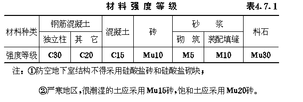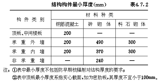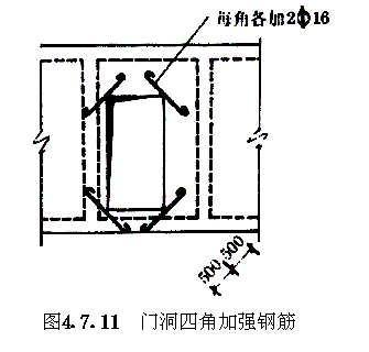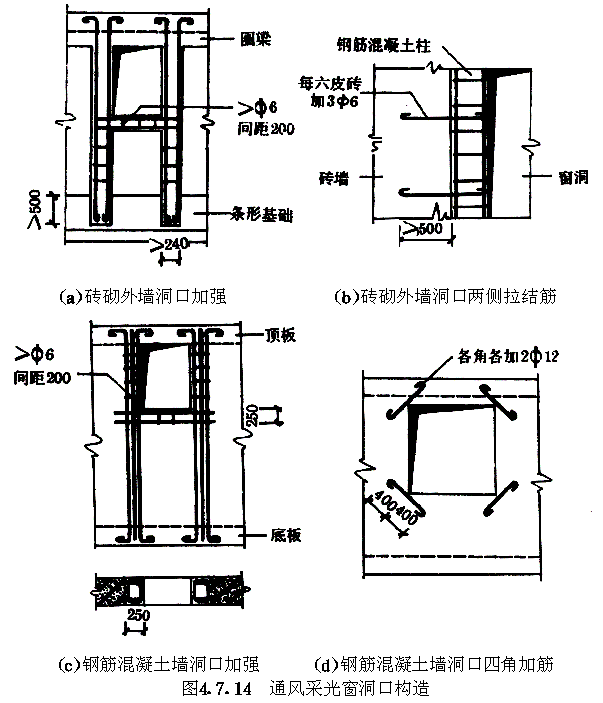 4.7 构造规定 4.7.1 防空地下室结构选用的材料强度等级不应低于表4.7.1的规定。 材料强度等级表4.7.1 4.7.2 防空地下室结构构件最小厚度应符合表4.7.2规定。 结构构件最小厚度(mm)表4.7.2 4.7.3 防空地下室结构变形缝的设置应符合下列规定。 4.7.3.1 在防护单元内不应设置沉降缝、伸缩缝。 4.7.3.2 上部地面建筑需设置伸缩缝、抗震缝时,防空地下室可不设置。 4.7.3.3 室外出入口与主体结构连接处,应设沉降缝。 4.7.3.4 钢筋混凝土结构设置伸缩缝最大间距应按现行有关标准执行。 4.7.4 钢筋混凝土受弯构件,宜在受压区配置构造钢筋,构造钢筋面积不小于受拉钢筋的最小配筋百分率;在连续梁支座和框架节点处,且不小于受拉主筋的1/3。 4.7.5 双面配筋的钢筋混凝土板、墙体应设置梅花形排列的拉结钢筋,拉结钢筋长度应能拉住最外层受力钢筋。当拉结钢筋兼作受力箍筋,其直径及间距应符合箍筋的计算和构造要求(4.7.5)。 4.7.6 连续梁及框架在距支座边缘1.5倍梁的截面高度范围内,箍筋配筋百分率应不低于0.15%,箍筋间距不宜大于ho/4,且不宜大于主筋直径的5倍。对受拉钢筋搭接处,宜采用封闭箍筋,箍筋间距不应大于主筋直径的5倍,且不应大于100mm。 图4.7.5拉结钢筋配制形式 4.7.7 承受核爆动荷载的钢筋混凝土结构构件,纵向受力钢筋的配筋百分率最小值应符合表4.7.7的规定。 钢筋混凝土结构构件纵向受力钢筋的最小配筋百分率表4.7.7 4.7.8 叠合板的构造应符合下列规定。 4.7.8.1 叠合板的预制部分应作成实心板,板内主钢筋伸出板端不应小于130mm。 4.7.8.2 预制板上表面应做成凸凹不小于4mm的人工粗糙面。 4.7.8.3 叠合板的现浇部分厚度宜大于预制部分厚度。 4.7.8.4 位于中间墙两侧的两块预制板间,应留不小于150mm的空隙,空隙中应加1Ф12通长钢筋,并与每块板内伸出的主筋相焊不少于三点。 4.7.9 混合结构应按下列规定设置圈梁。 4.7.9.1 当防空地下室顶板采用叠合板结构时,沿内、外墙顶应设置一道圈梁,圈梁应设置在同一水平面上,并应相互连通,不得断开。圈梁高度不宜小于180mm,宽度应同墙厚,上下应各配置3根直径为12mm的钢筋。箍筋直径不宜小于6mm,间距不宜大于300mm。当圈梁兼作过梁时,应另行验算。顶板与圈梁的连接处(图4.7.9),应设置直径为8mm的锚固钢筋,其间距不应大于200mm,锚固钢筋伸入圈梁的锚固长度不应小于240mm,伸入顶板内锚固长度不应小于lo/6(lo为板的净跨)。 4.7.9.2 当防空地下室顶板采用现浇钢筋混凝土结构时,沿外墙顶部应设置圈梁。在内隔墙上,可间隔设置,其间距不宜大于12m,配筋同上款要求。 图4.7.9顶板与砖墙锚固钢筋 4.7.10 防空地下室砖墙转角处及交接处当未设构造柱时,应沿墙高每隔500mm配置2Ф6拉结钢筋,且每边伸入墙内不宜小于1m。 4.7.11 平板防护密闭门门框墙的构造应符合下列要求。 4.7.11.1 门框墙厚度不应小于300mm。 4.7.11.2 门框墙的受力钢筋直径不应小于12mm,间距不宜大于250mm,配筋率不宜小于0.25%。 4.7.11.3 门洞四角的内外侧,应配置两根直径16mm的斜向钢筋,其长度不应小于1000mm(图4.7.11)。 图4.7.11门洞四角加强钢筋 4.7.12 防护密闭门、密闭门的钢制门框与门框墙之间应有足够的连接强度,相互连成整体。 4.7.13 防护密闭门、密闭门的门框与门扇应紧密贴合。 4.7.14 当战时采用挡窗板加覆土防护方式(图3.4.29-a)时,通风采光窗的洞口构造应符合下列规定: 4.7.14.1 对砖砌外墙,在洞口两侧应设置钢筋混凝土柱,柱上端主筋应伸入顶板,并应满足锚固长度要求,柱下端如为条形基础,应嵌入室内地面以下500mm(图4.7.14-a);当采用钢筋混凝土整体基础时,应将主钢筋伸入底板,并应满足锚固长度要求,柱断面不应小于240mm乘墙厚。 4.7.14.2 对砖砌外墙,在洞口两侧每6皮砖应加3根Ф6拉结钢筋,其伸入墙身长度不宜小于500mm,另一端应与柱内钢筋扎结(图4.7.14-b)。 4.7.14.3 对钢筋混凝土外墙,在洞口两侧应设置钢筋混凝土柱,柱上、下端主筋应伸入顶、底板,并应满足锚固长度要求(图4.7.14-c),且应在洞口四角各设置2Ф12斜向构造钢筋,其长度为800mm(图4.7.14-d)。 图4.7.14通风采光窗洞口构造 4.7.15 混合结构的防空地下室,由防护密闭门至密闭门的防护密闭段,应采用钢筋混凝土整体结构。