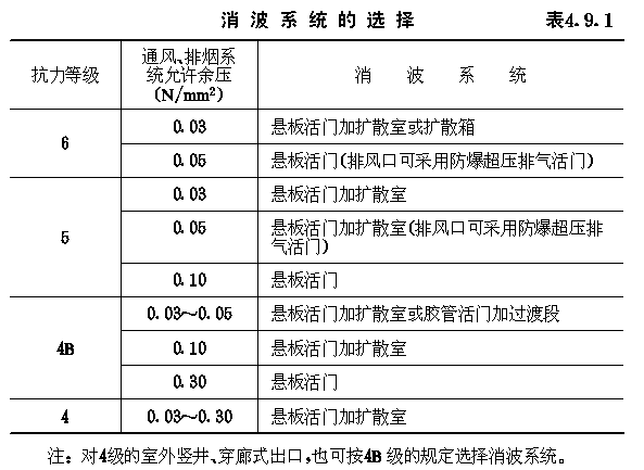 4.9.1 消波系统可根据防爆波活门的设计压力和通风、排烟系统的允许余压值按表4.9.1选用。