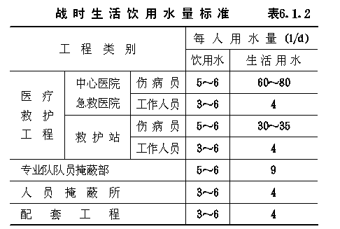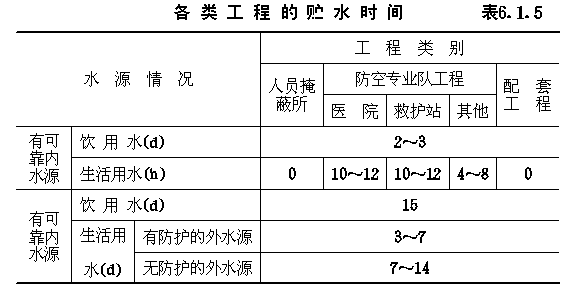 6 给水、排水 6.1 给水 6.1.1 防空地下室宜采用城市自来水或人防工程的区域水源作为供水水源。在有条件时,可设自备内水源或自备外水源。外水源宜采用地下水。 防空地下室的自备内水源或外水源的取水构筑物宜用管井或大口井。内水源取水构筑物应设于清洁区内;外水源取水构筑物的防护能力应与其供水的防空地下室中抗力最高的相一致。 6.1.2 防空地下室生活饮用水量标准应根据其用途、卫生设备的完善程度和当地的气候条件等因素综合考虑确定。平时用水量标准应按现行的国家标准确定;战时用水量标准应按表6.1.2采用。 6.1.3 生活饮用水的水质,应符合现行国家标准《生活饮用水卫生标准》的规定。 6.1.4 机械、通信和空调等设备用水的水质、水量、水压和水温应按其工艺要求确定。 6.1.5 防空地下室应在每个防护单元的清洁区设置生活饮用水贮水池(箱)。贮水池(箱)的容积应根据防空地下室的水源条件按照表6.1.5中规定的贮水时间计算确定。 6.1.6 生活饮用水池(箱)可兼作消防水池(箱),但应有临战时充满的措施,且其水质应能符合生活饮用的要求。 6.1.7 二等人员掩蔽所内的贮水池(箱),当平时不使用时,可在临战时构筑,但必须在工程施工时预留孔洞或预埋好进水、出水、溢流、放空等管道,并应有明显标志。同时还应有可靠的技术措施,以满足在战前规定的时间内构筑完毕。 6.1.8 饮用水的贮水池(箱)宜单独设置。若与其他用水贮存在同一贮水池(箱)中,应有饮用水不被挪用的措施。 6.1.9 生活用水、饮用水的供给,可采用气压给水装置、自动调速给水设备或高位水池(箱)。战时电源无保证的防空地下室,采用电动供水设备时,应设人力供水措施。 6.1.10 在内水源与外部水源(如城市自来水管网)的连接处,应设置有效的隔断措施(如设两个阀门、并在其中设置排水口等)。 6.1.11 给水系统的选择,应根据防空地下室的各项用水对于水质、水量、水压和水温的要求,并根据水源情况综合分析确定。在技术经济条件合理的条件下,应设置循环或重复利用的给水系统,并充分利用其余压。 6.1.12 防空地下室内部的给水管道,应根据装修要求及结构情况,可设于吊顶内、地沟内或沿墙明设。但严禁跨越通信和变、配电设备。 6.1.13 防空地下室内部的给水管道,应采用镀锌钢管,并作防腐处理。 6.1.14 对于可能产生结露的贮水池(箱)和给水管道,应根据使用要求,采取相应的防结露措施。 6.1.15 防空地下室的给水管道,当从出入口引入时,应在防护密闭门内设置防爆波阀门;当从围护结构引入时,应在外墙内侧或顶板内侧设置防爆波阀门,其抗力不应小于1MPa。该阀门应设置在便于操作处,并应有明显的启闭标志。 6.1.16 给水管道穿越防空地下室的人防围护结构时,应采取防震、防不均匀沉降和防水措施;穿过顶板的立管还应牢固地固定在顶板上。 6.1.17 防空地下室的给水引入管上,宜设单独的水表。 6.1.18 防空地下室的水泵间应有隔声措施,水泵应设减震器。
