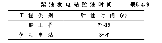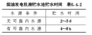 6.4 柴油发电站的给排水及供油 6.4.1 柴油发电机房的冷却水系统宜优先选用循环式或重复式,具体选型应根据所在地区的水源情况、气候条件及空调方式等因素,经综合比较后确定。 6.4.2 柴油发电机房内应设置贮水池。贮水池的容积应根据柴油发电机组在额定功率下冷却水的耗水量和要求贮水时间确定。贮水时间可按表6.4.2采用。 柴油发电机房贮水池贮水时间表6.4.2 6.4.3 柴油发电机冷却水的水温,可采用温度调节器或混合水池调节。当采用温度调节器由管路调节时,应充分利用柴油发电机自带的恒温器;当采用混合水池调节时,混合水池的容积,应按柴油发电机运行机组的额定功率工作5~15min的冷却水量计算。 6.4.4 在循环给水系统中,冷却废水可用冷却器、冷却水池等进行降温处理。 6.4.5 柴油发电机房内的用水管线,宜设于地沟内,地沟内应设集水坑,坑内宜设地漏排出积水。 6.4.6 柴油发电机进出水管上应设短路管。 6.4.7 柴油发电机的进、出水管上应设置温度计,出水管上应设置看水器,有存气可能的部位应设置放气阀。 6.4.8 柴油发电机房的输油管当从出入口引入时,应在防护密闭门内设置防爆波阀门;当从围护结构引入时,应在外墙内侧或顶板内侧设置防爆波阀门,其抗力不应小于1MPa,该阀门应设置在便于操作处,应有明显的启闭标志,并在适当位置设置油管接头。 6.4.9 燃油可用油箱、油罐或油池贮存,其数量不得少于两个。其贮油容积可根据柴油发电机额定功率的耗油量及贮油时间确定。柴油发电站的贮油时间可按表6.4.9采用。 柴油发电站贮油时间表6.4.9 6.4.10 油箱、油罐或油池宜用自流形式向柴油发电机供油。当不能自流供油需设油泵供油时,每台柴油发电机应设日用油箱。 6.4.11 柴油发电机的废热应充分利用,一般可用作淋浴洗消、供应热水的热源。 6.4.12 柴油发电机房的防火设计应符合《人民防空工程设计防火规范》的规定。 6.4.13 在柴油发电机房内的适当位置宜设置拖布池。