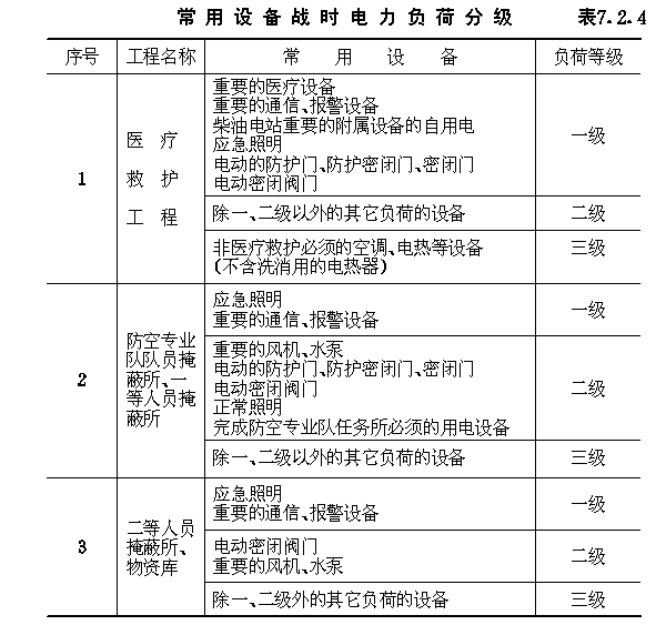 7.2 电源 7.2.1 防空地下室的电力负荷应按平时和战时的重要性及中断供电后可能造成损失的严重程度分为一级负荷、二级负荷和三级负荷。 7.2.2 防空地下室平时电力负荷分级,应符合地面同类建筑国家现行有关标准的规定。 7.2.3 防空地下室战时的电力负荷分级,应符合下列规定: 7.2.3.1 一级负荷:中断供电将严重影响指挥、通信、警报的正常工作;中断供电将危及人员的生命安全;不允许中断供电的重要用电设备;中断供电将造成人员秩序严重混乱或恐慌。 7.2.3.2 二级负荷:中断供电将影响指挥、通信、警报和防空专业队的正常工作;中断供电将影响人员生存环境。 7.2.3.3 三级负荷:不属于一、二级负荷的各项负荷。 7.2.4 防空地下室常用设备战时的电力负荷分级,应按表7.2.4确定。 7.2.5 电力负荷应按平时和战时两种情况分别计算。 7.2.6 各类防空地下室均应引接电力系统电源,平战结合的工程应满足平时电力负荷等级的需要。其供电容量应分别满足平时和战时总计算负荷的需要。当引接两路电力系统电源时,两路电源宜同时工作,任一路电源均应满足平时一级和部分二级负荷(消防负荷、不小于50%的正常照明负荷等)的用电需要。 常用设备战时电力负荷分级表7.2.4 7.2.7 当电力系统电源不能满足平时使用的一、二级负荷供电要求时,应设置柴油发电机组或蓄电池组作自备电源,柴油发电机组宜按战时区域内部电源设置。地面建筑所设置的自备柴油发电机组,宜设置在防护区内。 7.2.8 战时电力负荷除使用电力系统电源外,医疗救护工程应设置附属于该工程的区域内部电源。 7.2.9 供电系统设计,应符合下列原则: 7.2.9.1 防空地下室应单独设置配电屏(箱); 7.2.9.2 电力系统电源和柴油发电机应分列运行; 7.2.9.3 柴油发电站设置两台及以上机组时,应采用同容量、同型号的柴油发电机组; 7.2.9.4 通信、防灾报警、照明、动力应各有独立回路; 7.2.9.5 引接区域内部电源应有固定回路。 7.2.10 引接10KV电力系统电源的降压变压器,其容量在200KVA以上的宜设置在防空地下室内部,并应靠近负荷中心;对于容量小于200KVA的,其电源可直接由地面建筑的配电间(房)引进。 7.2.11 设置防空地下室内部的变压器,应选用防潮性能好的干式变压器。并应选用无油的断路器和电容器。 7.2.12 变压器的容量和台数应按下列要求设置: 7.2.12.1 引接一路10KV电力系统电源时,宜设置一台降压变压器;当变压器容量大于315KVA,且非空调季节与空调季节负荷之比较大时,宜设置两台变压器; 7.2.12.2 引接两路10KV电力系统电源时,应装设两台及以上变压器,当一台变压器停运时,其余变压器的容量(包括变压器的过载能力)应满足平时一级和部分二级负荷(消防负荷、不小于50%的照明负荷等)的用电需要。 7.2.13 医疗救护工程应按下列要求设置柴油发电机组: 7.2.13.1 柴油发电机组的容量,除必须满足本工程战时一、二级负荷需要外,还宜满足在低压供电半径范围内其它人防工程战时一、二级负荷用电的需要; 7.2.13.2 柴油发电机组的台数,不应少于两台,其中任一台机组发生故障后,其余机组应能满足战时一级负荷的用电需要。 7.2.14 平战结合的防空地下室应按下列原则设置柴油发电机组: 7.2.14.1 大型防空地下室应在工程内部设置内部电源,柴油发电机组的台数不应小于两台,其容量应按下列规定的战时和平时供电容量的较大者确定。 (1)战时供电容量,按本规范第7.2.13.1款确定。 (2)平时供电容量,有两路不同时停电电力系统电源时,应按本工程平时一级负荷中更重要的负荷确定;有一路电力系统电源时,应按本工程平时一级、部分二级负荷(消防负荷、不小于50%的正常照明负荷等)之和确定。 7.2.14.2 大型防空地下室如受条件限制,且内电源仅供本工程使用,柴油发电机组宜设1~2台,其容量应按下列规定的战时和平时供电容量的较大者确定: (1)战时供电容量应满足本工程战时一、二级负荷的用电需要; (2)平时供电容量按本规范第7.2.14.1款第(2)项的要求确定。 7.2.15 当人员掩蔽所、防空专业队掩蔽所布置较为集中时,应在其负荷中心处设置柴油电站,其台数和容量应按本规范第7.2.13.1款的要求确定。 7.2.16 战时一级负荷仅有供应急照明和少量通信报警设备的防空地下室,可设置蓄电池组作内部电源,其连续供电时间应与隔绝防护时间相一致,并应优先选用碱性镉镍电池。