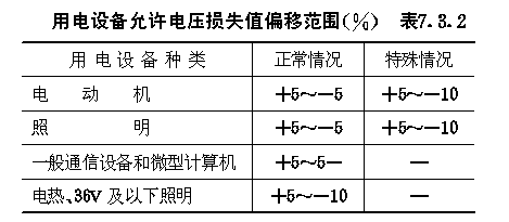 7.3 电力线路及敷设 7.3.1 电缆和电线应采用铜芯导线。 7.3.2 电缆、电线芯线截面选择,应符合下列要求: 7.3.2.1 铜芯电线芯线截面积,除灯头线不应小于0.5mm2外,其它均不应小于1.5mm2; 7.3.2.2 线路允许载流量不应小于其负荷计算电流; 7.3.2.3 从变压器低压侧出口端或备用发电机低压母线至用电设备端的允许电压损失值(按用电设备额定电压计),不应超过表7.3.2规定。 7.3.2.4 电线、电缆芯线截面的选择应与保护装置相匹配。 7.3.3 动力配电线路和照明配电干线,宜采用全塑型电缆。照明配电箱至灯具的支线宜采用塑料绝缘线或带塑料护套的塑料绝缘电线。 7.3.4 电缆和电线的穿管宜采用钢管,不同电压级和不同回路的线路,除下列情况外不应穿在同一根管内。 (1)电压为50V及以下的回路; (2)同一设备的电力回路和控制回路; (3)组合照明的所有回路; (4)同类照明的几个回路,但一根管内绝缘电线根数不宜超过八根。 用电设备允许电压损失值偏移范围(%)表7.3.2 7.3.5 进出防空地下室的电气线路,室外应采用埋地敷设的电缆经电缆防爆波井引入,并应预留备用穿线管。 7.3.6 穿越围护结构、防护密闭隔墙、密闭隔墙的电气管线及预留备用穿线钢管,应进行防护密闭或密闭处理,管材应选用镀锌钢管。 7.3.7 从低压配电室至每个防护单元的战时配电回路,应各自独立。当穿越其它防护单元时,在穿越的防护单元内应有防护措施。 7.3.8 从变压器或发电机组的低压侧至用电设备之间的配电级数,不宜超过三级。 7.3.9 一级和大容量的二、三级负荷宜采用放射式配电。同一负荷等级的用电设备,当采用链式配电时,每一回路的用电设备不宜超过五台,总容量不宜超过10kW。