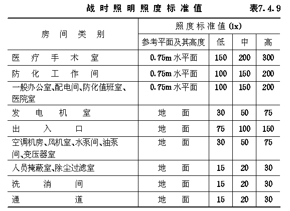 7.5 接地 7.4.1 动力、照明配电屏(箱),除因功能需要必须设在染毒区的,其余均应设在清洁区,并靠近负荷中心和便于操作维护处。 7.4.2 通风信号的设置,应符合下列规定: 7.4.2.1 设有清洁、滤毒和隔绝三种通风方式的防空地下室,应在值班室、风机室、发电机室、控制室、配电室、防化值班室及战时主要出入口最里一道密闭门的内侧,设置显示通风方式的音响和灯光信号,其控制开关宜设在值班室内; 7.4.2.2 战时人员主要出入口防护密闭门的外侧,应设置有防护能力的呼叫音响按钮,音响装置应设在防空地下室内人员值班室。 7.4.3 照明光源宜采用高效节能光源。并应满足照明场所对光源的颜色、显色性和防眩光等要求。 7.4.4 防空地下室平时和战时的照明,均应有正常照明和应急照明;平时使用还应有值班照明,出入口处应设过渡照明。 7.4.5 应急照明应由疏散照明、安全照明和备用照明组成。从正常照明电源发生故障停电至应急照明自动投入的时间,安全照明不应超过0.5s;疏散照明和备用照明不应超过15s。 7.4.6 平战结合的防空地下室平时照明,应按下列要求确定: 7.4.6.1 正常照明的照度,宜与同类地面建筑照度标准相同。需长期坚持工作和对视觉要求较高的场所,可适当提高。 7.4.6.2 灯具及其布置,应与使用功能及建筑装修相协调; 7.4.6.3 值班照明宜利用正常照明中能单独控制的灯具或应急照明; 7.4.6.4 应急照明应符合下列要求: (1)疏散照明应由疏散指示标志照明和疏散通道照明组成,其连续供电时间,不应少于30min。在疏散指示标志照明灯具正前方0.5m处的地面照度值,不应低于1lx;疏散通道照明的地面最低照度值,不应低于5lx; (2)安全照明的照度值,宜为正常照明照度值的5%~50%; (3)备用照明的照度值,不应低于正常照明照度值的10%。 7.4.7 战时的正常照明应与平时的部分正常照明或值班照明相结合。 7.4.8 防空地下室口部的过渡照明宜采用自然光过渡,当采用自然光过渡不能满足要求时,应采用人工照明过渡。过渡照明应能满晴天、阴天和夜间人员进出地下室的需要。 7.4.9 防空地下室战时照明的照度标准值,如无特殊要求,可按表7.4.9确定。 战时照明照度标准值表7.4.9 7.4.10 灯具的选择宜优先选用重量较轻的线吊或链吊灯具和卡口灯头。当室内净高较低或平时使用需要而选用吸顶灯时,应考虑在临战时加设防掉落保护网的措施。 7.4.11 每个防护单元应各有独立的照明回路,并宜采用两回路供电。 7.4.12 照明系统的每一个回路,电流不宜超过15A,灯和插座数量除花灯、彩灯和大面积照明等回路外,不宜超过20个,最多不应超过25个。 7.4.13 自防空地下室内部引至防护门(防护密闭门)以外的照明回路,应在该门内侧单独设置短路保护装置或设置单独照明回路。