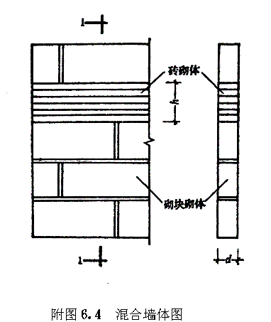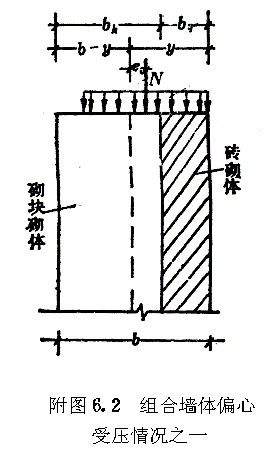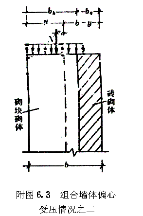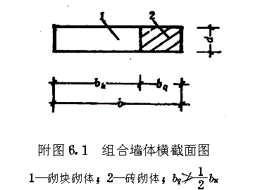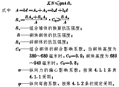 (1)对墙体厚度d方向的计算 公式 (2)对墙体宽度b方向的计算 当沿墙宽b方向承受垂直偏心荷载时,还应对宽度方向按偏心受压构件进行计算。 ①组合墙体横截面的重心应按换算成同一材料的截面(Az)的重心采用。 换算截面时,砌块砌体和砖砌体的宽度分别按其实际宽度(bκ或bq)采用,而厚度应按下式计算: 砌块砌体的厚度dκ=d; 砖砌体的厚度dq=d×(Rq/R)。 ②墙体偏心受压时,按下式计算: KN≤φAcRzc 式中 φ——纵向弯曲系数,按第4.1.2条的规定采用; |