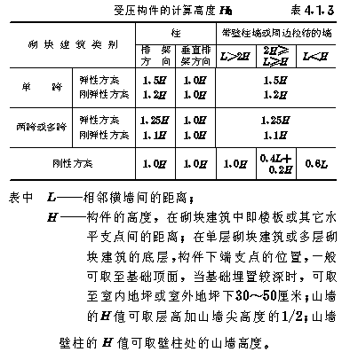 第 4.1.3 条 受压构件的计算高度H0,应根据砌块建筑类别和构件上端支承情况等条件,按 表4.1.3 采用: