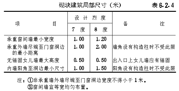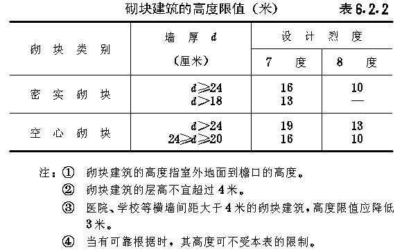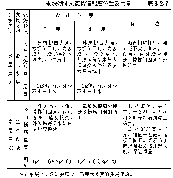 第6.2.2条 设计烈度为7度和8度的砌块建筑的高度不宜超过表6.2.2的规定。 第6.2.3条 设计烈度为7度或8度的密实砌块建筑,加设钢筋混凝土构造柱后,其高度限值可按表6.2.2增加3米。构造柱间距不大于8米。施工时必须先砌墙后浇柱。柱的截面不应小于24×18厘米,主筋不小于4直径12,箍筋间距不宜大于25厘米。墙与柱之间应沿墙高度在每皮水平灰缝中设2直径6钢筋联结,钢筋伸入墙内不少于1米。构造柱应与圈梁联结。 第6.2.4条 砌块建筑局部尺寸宜遵守表6.2.4的规定。 第6.2.5条 圈梁的设置,除必须满足一般构造要求外,尚应闭合,并宜在楼板同一标高处或紧靠楼板设置。多层砌块建筑每层均应设置圈梁:外墙及内纵墙应全部设置;设计烈度为7度时,内横墙圈梁间距不大于7米,8度时,不大于4米。圈梁高度不小于20厘米。设计烈度为7度、8度时,其配筋分别不少于4直径8、4直径10,箍筋间距不大于20厘米。设计烈度为7度时,屋顶圈梁应现浇,8度时,每层圈梁均应现浇。 单层空旷砌块建筑在檐口高度处应设闭合现浇圈梁一道。檐口高度大于4米时,应增设圈梁一道。圈梁配筋不小于4直径12,箍筋间距不大于20厘米。 圈梁内钢筋绑扎搭接长度不应小于40倍钢筋直径。 注:墙厚小于24厘米时,应在屋盖及每层楼盖处沿所有内外墙设置圈梁。 第6.2.6条 抗震横墙除进行强度验算外,其最大间距尚应遵守表6.2.6的规定。 第6.2.7条 砌块砌体抗震构造配筋应按表6.2.7规定采用。 第6.2.8条 预制板在墙上的搁置长度应满足第5.2.11条要求。如不能满足时,应在与墙或梁垂直的板缝内配置不小于1直径6钢筋,钢筋两端伸入板缝内的长度均为1/4板跨。山墙处应用1直径6“U”形锚固筋,伸入板缝内长度为1/4板跨。 当板跨大于4米并与外墙平行时,楼盖和屋盖预制板紧靠外墙的侧边宜与墙或圈梁拉结。 砌块建筑端部为大房间的楼板,及设计烈度为8度的砌块建筑的屋盖,应加强钢筋混凝土预制板相互间以及板与梁、墙与圈梁的拉结。 第6.2.9条 楼梯间不宜设在房屋端部的第一开间。 设计烈度为8度时,楼梯间及门厅内墙阳角处的大梁支承长度,不应小于50厘米,且应与圈梁联结。 不应采用悬挑式楼梯踏步及有竖肋插入墙体的预制楼梯踏步。 第6.2.10条 当设计烈度为8度并遇到下列情况之一时,宜用防震缝将砌块建筑分成若干体形简单、结构刚度均匀的独立单元。 一、砌块建筑立面高差在6米以上; 二、砌块建筑有错层,其楼板高差较大; 三、各部分结构刚度截然不同。 防震缝应沿砌块建筑的全高设置,其两侧应布置墙。基础可不设防震缝。防震缝的宽度根据砌块建筑高度和设计烈度的不同,一般可参照表5.2.13选用。 |