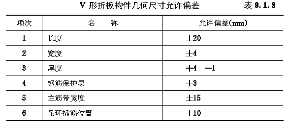 第九章 屋盖工程验收 第 9.1.1 条 验收V形折板构件时,应具备钢筋(钢丝)和混凝土的强度试验记录、预应力张拉记录。 第 9.1.2 条 V形折板出厂前,不应有蜂窝、麻面、露筋、掉边、缺角等破损。 第 9.1.3 条 V形折板外形几何尺寸的允许偏差,应符合 表9.1.3 中的规定。允许偏差项目的抽查点的70%达到设计要求时,方为合格。V形折板构件的抽查数量,应不小于构件总数的5%,且不少于3折。 第 9.1.4 条 V形折板主筋带部位不允许有任何裂缝。其它部位的裂缝,在下列范围内仍可认为合格: 一、安装前,V形折板端部裂缝的长度l1<0.3(b为V形折板板面宽度)。 二、安装前,垂直于V形折板跨度方向的中部外侧裂缝长度l2<0.3b(b为V形折板板面宽度)。 三、V形折板板面裂缝宽度不大于0.2mm( 图9.1.4 )。 第 9.1.5 条 成批生产V形折板构件时,应按生产数量的1%,并不少于每年一折抽样进行静荷载检验。 第 9.1.6 条 当V形折板符合上述要求时,方可签发构件出厂合格证。 |