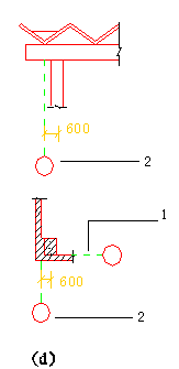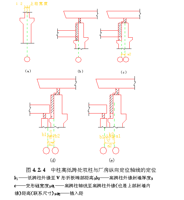 一、除变形缝处的柱和端部柱处以外,柱的中心线应与厂房横向定位轴线相重合; 二、变形缝处应设双轴线,轴线间为插入距α2,轴线距柱中心线应为600mm(图4.2.1a); 三、端部柱中心线与厂房横向定位轴线的定位,可根据墙与柱的结合形式采取以下不同方式: 1.端部柱中心线与厂房横向定位轴线相重合(图4.2.1b); 2.端部柱外边缘与厂房横向定位轴线相重合(图4.2.1c); 3.端部柱中心线自厂房横向定位轴线内移600mm(图4.2.1d) 第4.2.2条 山墙与厂房横向定位轴线的定位,宜遵守下列规定: 一、当山墙厚度小于或等于240mm时,墙内缘宜与厂房横向定位轴线重合(图4.2.2a、b); 二、当山墙厚度大于240mm时,墙内缘与厂房横向定位轴线的距离,宜为120mm的倍数或1/2墙厚;当为柱承重时,轴线与柱中线的距离为600mm( 图4.2.2c、d)。 第4.2.3条 纵墙、边柱与厂房纵向定位轴线的定位,应遵守下列规定: 一、柱距小于或等于6m的一般厂房(包括有悬挂吊车的厂房)的边柱外缘和墙内缘应与厂房纵向定位轴线相重合(图4.2.3a); 二、当纵墙承重并设有壁柱时,墙内缘宜与厂房纵向定位轴线相重合。当不重合时,墙内缘与厂房纵向定位轴线的距离宜为半砖(即120mm)的倍数或1/2墙厚(图4.2.3b); 三、在设有桥式吊车的厂房中,考虑吊车起重量、柱距和构造等要求,边柱外缘与厂房纵向定位轴线间可加设联系尺寸α1(图4.2.3c),并遵守下列规定: 1.当吊车起重量小于或等于20t时,α1=0; 2.当吊车起重量为30t或50t和柱距为6m时,α1=150mm; 3.当吊车起重量大于50t时,柱距为12m时,α1=250mm或500mm。 第4.2.4条 中柱与厂房纵向定位轴线的定位,应遵守下列规定: 一、等高厂房的中柱,其上柱的中心线应与厂房纵向定位轴线相重合(图4.2.4a); 二、高低跨处采用单柱时,高跨上柱外缘和封墙内缘应与厂房纵向定位轴线相重合(图4.2.4b); 当上柱外缘与厂房纵向定位轴线不能重合时,应采用两条定位轴线,其插入距α2值按需要确定(图4.2.4c); 三、当高低跨处的变形缝设双柱时,应采用两条定位轴线,其插入距α2值为变形缝的宽度c加高跨柱外缘封墙厚度b2及低跨柱外缘至V形折板端部距离b1(图4.2.4d);或为变形缝的宽度c加高跨柱外缘封墙厚度b2加低跨柱外缘至V形折板端部距离b1及联系尺寸α1(图4.2.4e)。 第4.2.5条 纵横跨变形缝处应设两条定位轴线,其插入距α2值应为变形缝的宽度c加高跨处外缘封墙厚度b2加边折的1/2波宽(图4.2.5a);或为变形缝的宽度c加高跨处外缘封墙厚度α1加边折的1/2波宽及联系尺寸α1(图4.2.5b、c)。 |