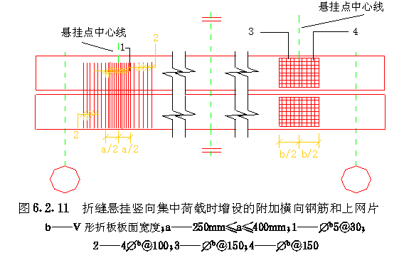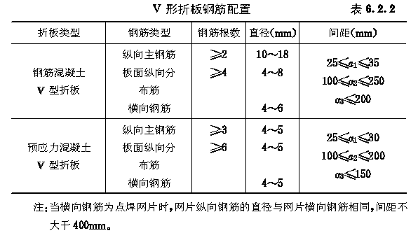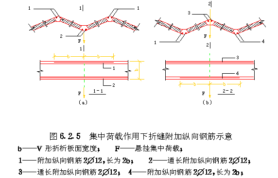 第二节 钢筋配置 第6.2.1条 V形折板钢筋的配置顺序:下网片的受力横向筋在下,纵向钢筋在上;上网片的横向钢筋在上,纵向钢筋在下;支座上网片的横向钢筋在下,纵向钢筋在上;纵向受力钢筋居中,不得倒放(图6.2.1)。 第6.2.2条 V形折板的钢筋配置(图6.2.2),应符合表6.2.2的要求。 (Ⅰ)纵向钢筋 一、板面纵向分布预应力钢筋在V形折板受压边缘一侧的配置,应不少于两根。 二、受拉区纵向预应力主钢筋的分布宽度,应不大于b/4。 三、为减少受拉区纵向主钢筋的分布宽度,必要时可采用双根并列配置(图6.2.3a);在特殊需要时也可采用三根成束布置(图6.2.3b)。 钢筋双根并列和三根成束配置,见图6.2.3; 四、当采用碳素钢丝双根并列或三根成束配置时,混凝土强度等级应分别不低于C50和C55,放张阶段的混凝土立方强度分别不宜低于设计的混凝土强度等级的85%和95%。 五、在预应力主钢筋向板面分布钢筋的过渡部位,纵向分布钢筋间距宜适当加密,以防预应力钢筋放张时产生的混凝土压应力突变,引起板面开裂。 第6.2.4条 V形折板屋盖上下折缝中应分别设置一根直径8和一根直径12的附加纵向钢筋(图6.3.1和图6.3.2a~c)。在伸缩缝两边或边折的下折缝应设置两根12的附加纵向钢筋(图6.3.2d)。 第6.2.5条 当V形折板屋盖上下折缝有集中荷载作用时,应按下述规定增设附加纵向钢筋: 一、当集中荷载作用于下折缝时,在该下折缝处应增设2直径12通长附加纵向钢筋,并在相邻两个上折缝处应分别增设2直径12的附加纵向钢筋,长度为2b(图6.2.5a)。 二、当集中荷载作用于上折缝时,在该上折缝处应增设2直径12通长附加纵向钢筋,并在相邻两个下折缝处应分别增设2直径12的附加纵向钢筋,长度为2b(图6.2.5b)。 (Ⅱ)钢筋网片和横向钢筋 第6.2.7条 V形折板构件两端部应设置上网片。上网片从板端开始并伸入支座内,伸入支座内长度应不小于1000mm(图6.2.7)。 第6.2.8条 当V形折板构件跨度l≥15m时,应在跨中部位增设上网片,网片长度应不小于2000mm(图6.2.8)。 第6.2.9条 当V形折板悬臂长度lt≥3m时,尚应在悬臂长度lt≥3m的一端支座上设置上网片,其长度lw在预应力混凝土和钢筋混凝土V形折板上分别为1.5b和1.0b(b为板面宽度)(图6.2.9)。 第6.2.10条 为减小预应力混凝土V形折板放张时板端裂缝,极端头100mm范围内应增加横向钢筋3~4根,钢筋直径与网片横向钢筋相同。 第6.2.11条 当V形折板折缝处悬挂竖向集中荷载时,尚应按下列原则在悬挂竖向集中荷载处增设附加横向钢筋和上网片: 一、当V形折板下折缝悬挂竖向集中荷载时,应按下式计算附加横向钢筋的总截面面积: 二、增设的上网片长度应不小于V形折板板宽b,钢丝间距不大于150mm(图6.2.11b),与第6.2.8条规定的上网片重迭部分可不设置。 折缝悬挂竖向集中荷载时增设的附加横向钢筋和上网片,见图6.2.11。 (Ⅲ)吊环和插筋 第6.2.12条 吊环和插筋应沿V形折板构件两侧对称设置,其间距1.0~1.5m。吊环处V形折板中应设置加强钢筋26。 必要时也可将插筋改为吊环。插筋在V形折板内一端和加强筋的两端均应做弯钩(图6.2.12)。 |