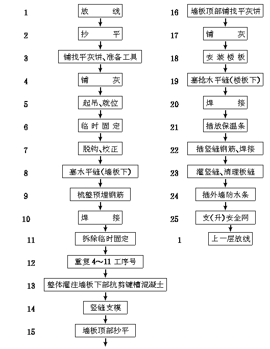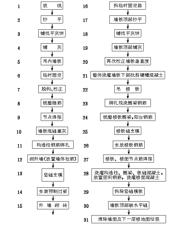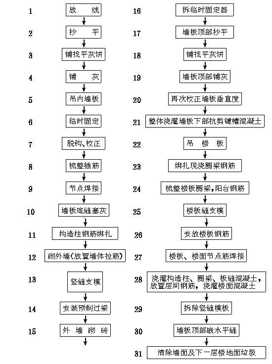 在非采暖区及采用材料防水做法地区的大板建筑也可引用此工艺。但不必进行21、24两道工序。 2.外墙采用砖墙的“内板外砖”体系宜按下列要求进行: (1)采用先安装内墙板后砌砖外墙的 施工顺序 :