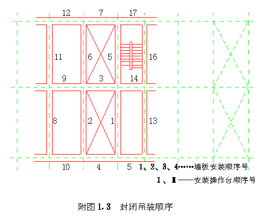 3.吊装墙板次序宜采用分层吊装,由中间开始,先内墙、后外墙,逐间封闭。封闭吊装顺序可见 附图1.3 。