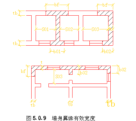 第 5.0.9 条在考虑纵横墙的共同工作时,墙身翼缘的有效宽度如 图5.0.9 所示,其值b f 可取 表5.0.9 所列各项中的最小值。