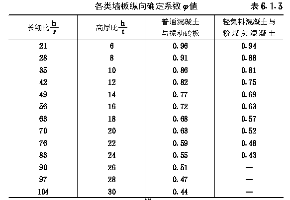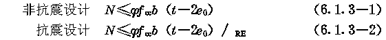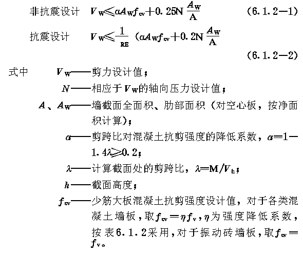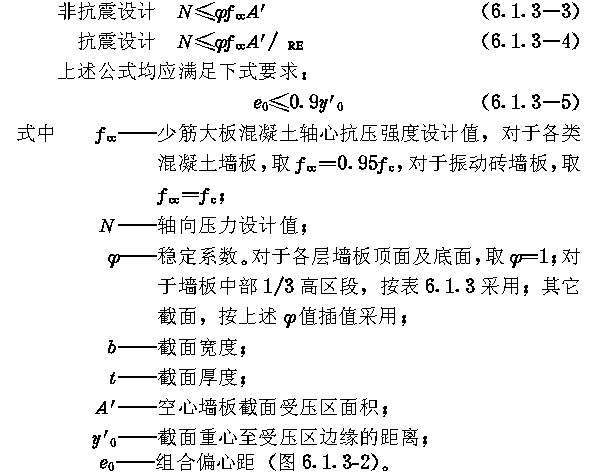 第 六章 承载力计算 第 6.1.1 条少筋大板结构墙体应进行斜截面受剪、平面内偏心受压、出平面偏心受压及局部承压等承载力计算。 第 6.1.3 条少筋大板墙体在竖向荷载和出平面水平荷载作用下,截面受压承载力( 图6.1.3 )按下列公式计算: 一、对于实心墙板(图6.1.3-1a) 公式 二、对于空心墙板(图6.1.3-1b、c) 公式 混凝土空心墙板截面受压区面积A′,可根据截面面积等效及惯性矩等效折算为I字形截面,并按轴向力作用点与受压区内合力点相重合的原则由 下列公式 计算确定: 第 6.1.4 条少筋大板墙体局部受压承载力可按现行国家标准《混凝土结构设计规范》GBJ10规定进行计算,其中fcc=0.95fc,对于振动砖墙板,取fcc=fco。对抗震计算,尚应符合本规程第5.0.2条的规定。