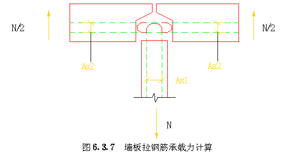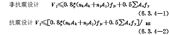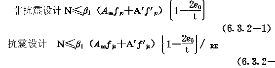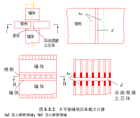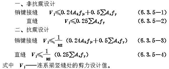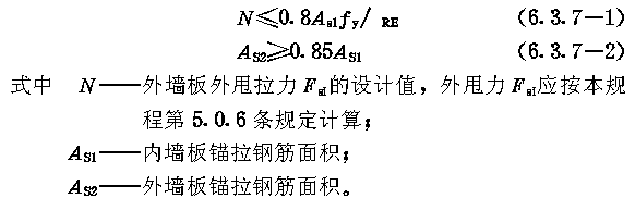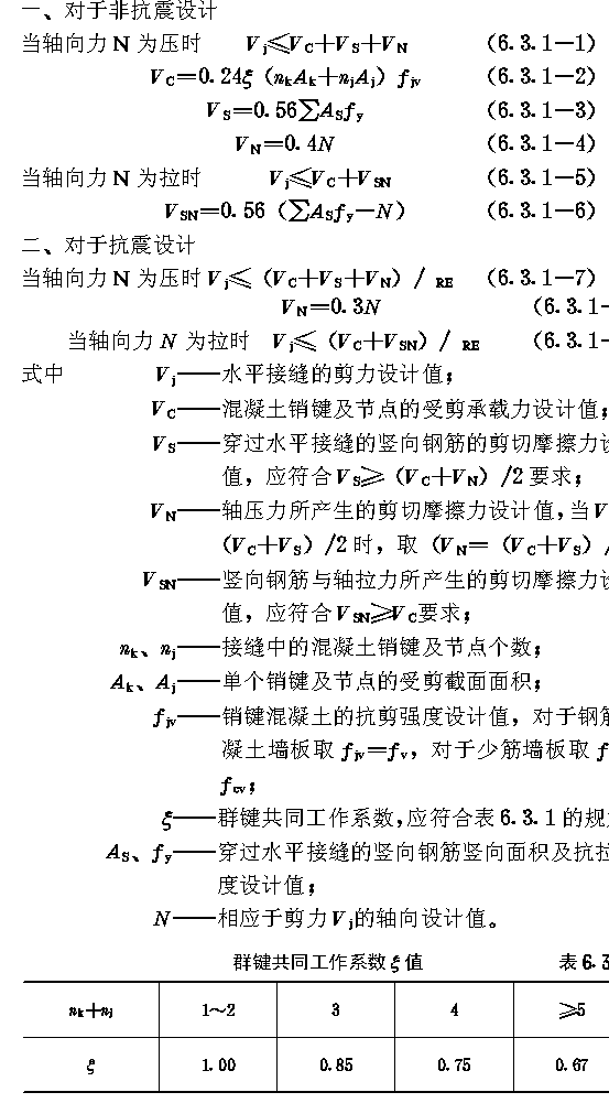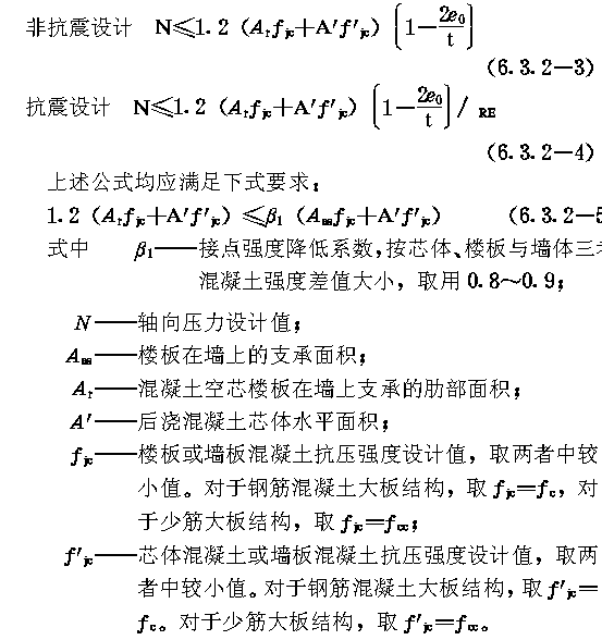 第三节 接缝承载力计算 第 6.3.1 条墙板水平接缝受剪承载力应按 下列公式 计算: 第 6.3.2 条墙板水平接缝沿墙板出平面受压承载力应按下列公式计算: 二、当为空心楼板时(图6.3.2b) 公式 第 6.3.3 条墙板水平接缝沿墙板平面偏心受压和偏心受拉承载力可按照现行国家标准《混凝土结构设计规范》GBJ10的规定计算,其接缝材料的等效抗压强度设计值fce应按 下列公式 计算: 第 6.3.4 条墙板竖向接缝的受剪承载力按 下式 计算: 第 6.3.5 条连系梁竖向接缝的受剪承载力按 下列公式 计算: 第 6.3.6 条连系梁竖向接缝的受弯承载力按 下式 计算: 第 6.3.7 条抗震设计内外墙板的锚拉钢筋承载力应按 下列公式 计算( 图6.3.7 ):