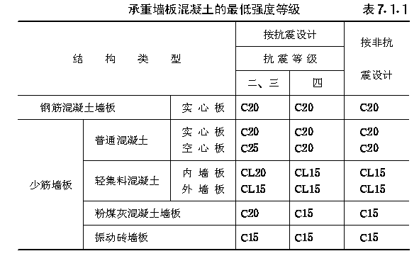 一、承重墙板所用混凝土的最低强度等级应符合 表7.1.1 的规定;
