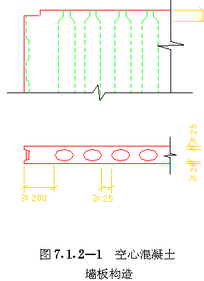 三、空心混凝土墙板的厚度不宜小于140mm。芯孔间肋宽及板面厚度不应小于25mm。在墙板顶部应缩小孔径或填实,其高度不小于80mm,板边与第一孔的间距不应小于200mm。墙板吊环部位及窗口下部不宜抽孔( 图7.1.2-1 );