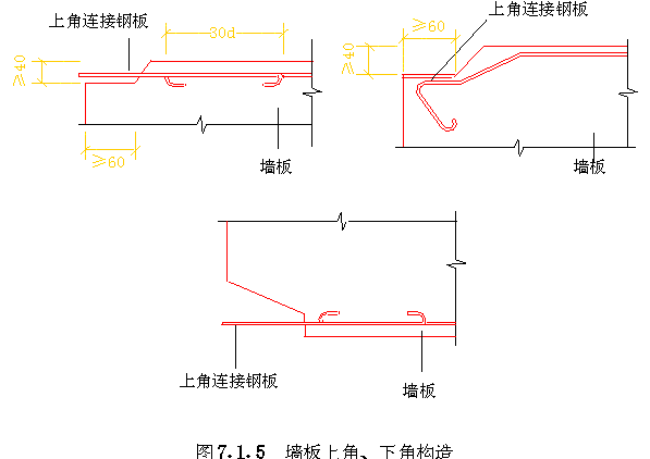 第 7.1.5 条墙板两上角应分别设置不小于28(八层或八层以上的大板不小于212)的连接钢筋或钢板,并应与墙板内顶部的水平钢筋焊接。在墙板的两下角应分别伸出28的连接钢筋。墙板上、下角均应设有保证整体连接对缺口( 图7.1.5 )。