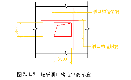 第 7.1.7 条门窗连梁部位及其钢筋锚固部位不宜开洞。当必须开洞时,洞口位置宜布置在跨中及截面高度中间三分之一范围内。孔洞宜设钢套管加强,并将箍筋适当加密。钢筋混凝土墙板开有较小孔洞(洞的高和宽均小于800mm)时,应沿洞口周边设置构造钢筋,其截面面积不小于被洞口切断的钢筋面积,或每边不小于212,该钢筋自孔洞边角算起伸入墙内的长度不应小于40d( 图7.1.7 )。