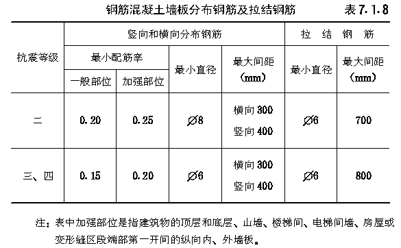 二、横向和竖向分布钢筋的最小配筋率及墙板双排配筋的拉结钢筋应符合 表7.1.8 的规定;