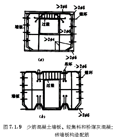 第 7.1.9 条少筋混凝土墙板、轻集料和粉煤灰混凝土墙板、粘土砖振动砖墙板的配筋应符合下列要求:
