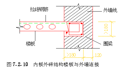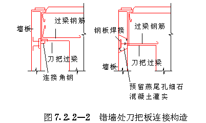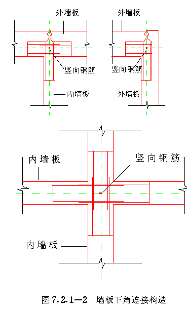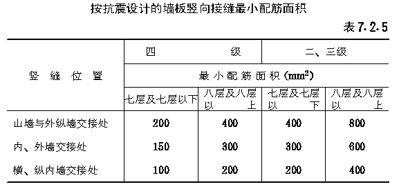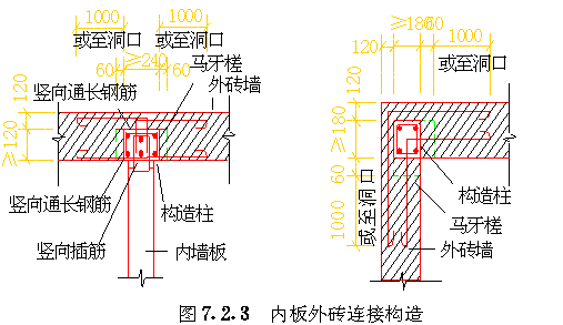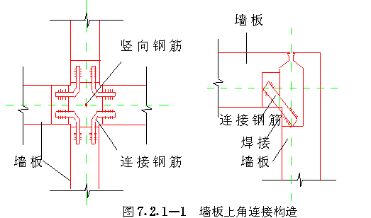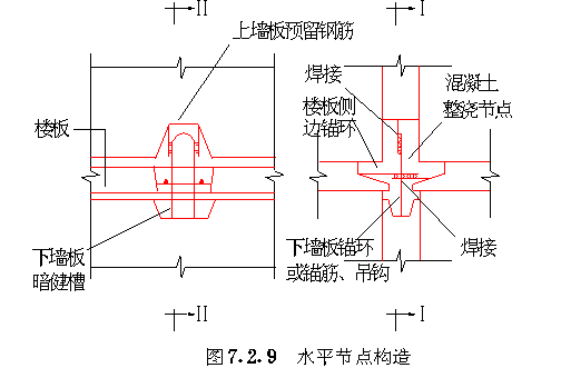 第二节 节点、接缝连接 第 7.2.1 条墙板上角应采用钢筋或钢板焊接连接( 图7.2.1-1 )。墙板下角可用伸出的钢筋搭接连接( 图7.2.1-2 ),焊接或搭接长度应符合国家现行有关标准的规定。 第 7.2.2 条“刀把板”上角的连接与一般墙板的连接做法相同。刀把过梁下角必须与相邻墙板伸出的钢筋焊接。墙板伸出钢筋其截面面积不应小于刀把过梁下部钢筋的截面面积,在墙板内的锚入长度不应小于40d。当刀把过梁处需要设置现浇混凝土小柱时,刀把过梁下部钢筋可弯入小柱内,其锚入长度不应小于40d。刀把过梁端部侧边应设置键槽及锚环或拉结锚筋,锚环或拉结锚筋在墙板内的锚入长度不应小于40d。在两相邻墙板竖向接缝的锚环内应插入竖向插筋,或将两墙板的拉结锚筋相互焊接( 图7.2.2-1 )。 第 7.2.3 条内板外砖结构的外砖墙与内墙板相交处,应在外墙内设置构造柱,其尺寸不应小于120mm×240mm,构造柱应留出马牙槎60mm,其高度不应大于300mm,马牙槎之间的净距不应大于300mm。内墙板侧边的锚环应伸入构造柱内,自构造柱向两侧砖墙伸出6锚拉钢筋,伸入砖墙的长度为1000mm或伸至门窗洞口,锚拉钢筋的竖向间距不大于500mm。构造柱的锚环内应插入竖向通长钢筋,其直径不应小于Φ8。同时应按水平缝抗剪承载力计算设置竖向插筋。构造柱四角的竖向钢筋,按非抗震设计时不应小于48;按抗震设计时不应小于4Φ10,其箍筋不应小于Φ4@200( 图7.2.3 a)。 外墙转角处的构造柱尺寸不应小于180mm×180mm,构造柱的马牙槎及向两侧砖墙伸出锚拉钢筋等做法均应符合上述规定。构造柱四角竖向钢筋,按非抗震设计时,不小于410;按抗震设计时,不小于412,箍筋不小于4@150(图7.2.3b)。 按非抗震设计的竖向接缝内的竖向钢筋可按表7.2.5中四级抗震等级的规定配置。 第 7.2.8 条墙板与楼板、屋面板、基础之间的水平接缝必须坐浆,但水平接缝销键处不得铺放砂浆。 第 7.2.10 条内板外砖结构的楼板与外墙的连接,应从楼板内伸出拉结钢筋与圈梁连接,拉结钢筋每开间内不少于2Φ8( 图7.2.10 )。 第 7.2.11 条连接钢板用3号钢,钢筋应用Ⅰ级钢。钢板的厚度不应小于4mm,焊接钢筋的直径不应小于8mm。受力焊缝的长度应满足与锚拉钢筋等强的要求,焊缝高度不应小于4mm,焊条应用T42。连接钢筋的锚固长度不应小于30d。