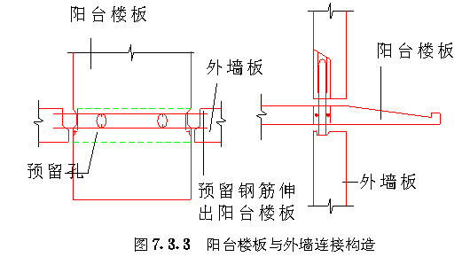 第三节 其它构造 第 7.3.1 条大板建筑的基础,当采用砖砌条形基础时,砖的强度等级不应小于MU7.5,砂浆的强度等级不应小于M5,当采用混凝土基础时,混凝土的强度等级不应低于C15。 第 7.3.2 条在与墙板竖缝以及按计算需配置竖向钢筋的墙板节点的对应位置上,应设置基础暗柱或构造柱,以锚固竖向钢筋于基础底部。 箱形基础或基础圈梁顶面,沿外墙宜设置防水台阶与上层外堵板构成防水接缝。 第 7.3.3 条当阳台作为楼板构件的延伸部分时,阳台楼板边缘应预留缺口以保证外墙板竖向接缝中钢筋贯通,及便于竖向接缝混凝土浇灌。在阳台楼板上预留Φ200孔洞,以便外墙板中竖向钢筋或吊环向上连续贯通。阳台楼板上应预留钢筋与外墙水平圈梁钢筋搭接,钢筋根数、直径应与水平圈梁相同,其伸出阳台楼板的长度不应小于45d( 图7.3.3 )。 第 7.3.4 条楼梯的梯段与平台板之间、平台板与墙板之间均必须用预埋件焊接。平台板的横梁支承长度不宜小于100mm。 第 7.3.7 条大板建筑首层布置大空间时,第一、二层现浇墙体混凝土强度等级不应小于C25,在第二层层高范围内,可将墙体分为下、上两区,下区钢筋配置不少于10,其间距不应大于150mm,且应双排、双向布置,上区按配筋率大于等于0.20%进行配筋。首层框支柱和剪力墙的钢筋应延伸至第二层,其搭接长度不应小于45d,并将搭接钢筋的两端用单面焊接连接,焊接长度不应小于3d。