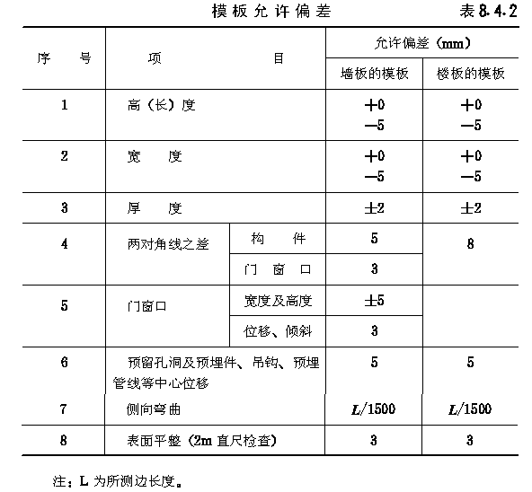 第 8.4.2 条对新制或检修的模板均应逐块检查。对连续周转使用的模板,应按每季度或每生产线生产1000块板材;按同一类型模板件数抽查10%,但不少于3件,模板允许偏差应符合 表8.4.2 的规定。