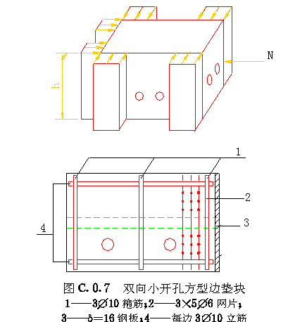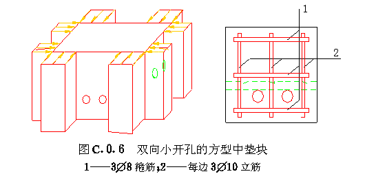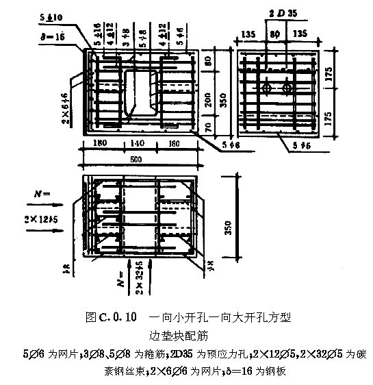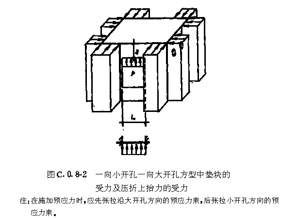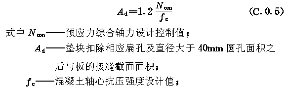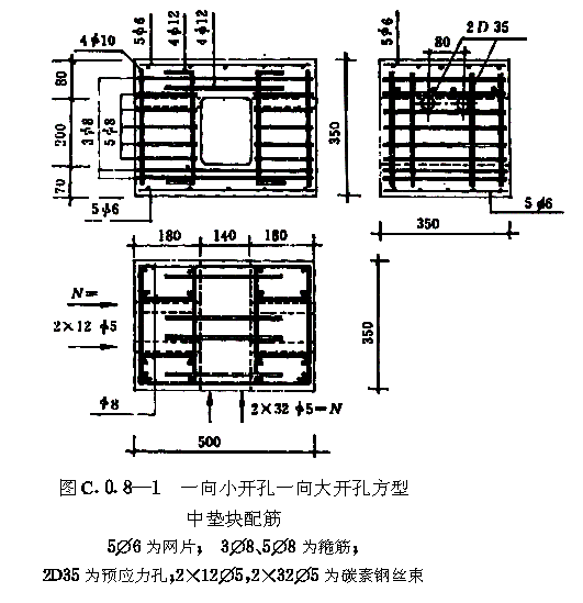 附录C 垫块的设计与施工 C.0.1 本附录适用于本规程图3.2.2—2拼板中所示垫块,可分下列两大类型: C.0.1.1 方垫块(图3.2.2—2(a)),双向承受水平预应力,一般采用预制,可分为双向小开孔及一向小开孔一向大开孔两种; C.0.1.2 扁垫块(图3.2.2—2(b)),单向承受水平预应力,一般采用现浇,可分为单向小开孔及单向大开孔两种。 位于楼盖中部的垫块称为“中垫块”,相应地位于楼盖边部的垫块称为 “边垫块”。 C.0.2 垫块的高度不应小于楼盖构件的高度,方垫块的平面尺寸可与柱截面尺寸相同,扁垫块应贴板角设置。 C.0.3 垫块小开孔是指直径小于或等于40mm的圆孔,大开孔是指扁孔或直径大于40mm的圆孔。大开孔的上下混凝土板的厚度不宜小于60mm。 C.0.4 垫块混凝土必须密实,且强度等级必须符合设计要求,当设计无要求时,不得低于楼盖构件混凝土强度等级,如果施工条件较差,可将强度等级相应提高一级。 C.0.5 所有垫块只需具备施加预应力时的承载力。施加预应力时抗裂、使用阶段承载力及抗裂均可不考虑。 施加预应力时的承载力应包括抗压、抗弯、抗剪、抗局压、抗冲切等内容,其中抗压承载力应符合下式规定: C.0.6 双向小开孔的方垫块,当符合本规程第C.0.5条规定时,其“中垫块 ”可按 图C.0.6构造配筋。 C.0.7 双向小开孔的方垫块,当符合本规程第C.0.5条规定时,其“边垫块 ”尚应具备在端锚具作用下的抗弯、抗剪及局压承载力,其构造配筋可参照 图C.0.7。 C.0.8 一向小开孔一向大开孔的方垫块,当符合本规程第C.0.5条规定时,其“中垫块”可参照图C.0.8—1配筋。 垫块大开孔处一般不宜直接承受压折上抬力,压折定位装置可设在垫块两侧楼板上,即采用图6.1.15(c)(d)所示方法。 若大开孔处有压折上抬力,大开孔上部混凝土板尚应具备抗弯、抗剪、抗冲切承载力 (图C.0.8—2)。 C.0.9 一向小开孔一向大开孔的方垫块,当符合本规程C.0.5条规定时,其 “边垫块”尚应具备在端锚具作用下的抗弯、抗剪及局压承载力,在施加预应力时,应先张拉沿大开孔方向的预应力束,后张拉小开孔方向的预应力束 (图C.0.9)。有关压折上抬力的规定与C.0.8条相同。 C.0.10 一向小开孔一向大开孔的方型边垫块的配筋可参照图C.0.10。 C.0.11 扁垫块可分为小开孔与大开孔两种,其边垫块与中垫块的受力可视为一样,现浇时可预埋铁皮成孔,不得抽孔成型。在满足本规程第C.0.2、C.0.3、C.0.4条及C.0.5条规定的前提下,扁垫块可用素混凝土浇制,也可配置少量构造钢筋。 C.0.12 垫块的制作应符合本规程第7.5节及第7.6节的规定。有条件时,宜在成批生产前对预制垫块进行承载力试验。