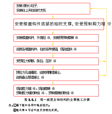 3.6.1 主体结构的施工步骤宜由下而上逐层进行,即在每一层楼盖施加预应力完毕后,再吊装上一层楼盖构件。每一楼层主体结构的主要施工步骤应符合
