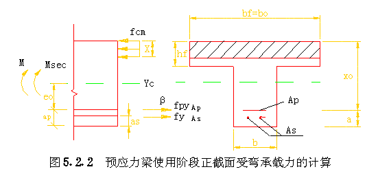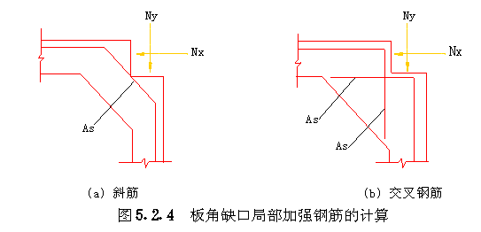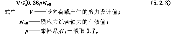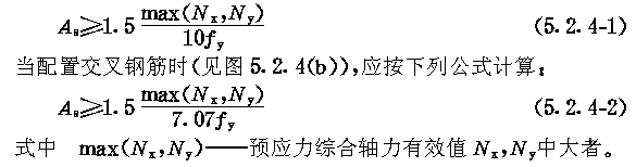 5.2 承载力计算 5.2.1 承载力及配筋计算应符合下列规定: 5.2.1.1 不考虑预应力对预制楼板内肋的作用,内肋的配筋可由竖向荷载承载力决定。 5.2.1.2 预制楼板边肋的普通钢筋,一般可根据预制构件的运输、安装阶段承载力要求配置。明槽中预应力束,除应满足节点竖向摩擦抗剪要求外,尚应满足施加预应力后使用阶段抗弯承载力要求。 5.2.1.3 在有叠合层的板柱节点处,宜考虑叠合层中普通钢筋承受10%~20%的负弯矩。但该普通钢筋必须连续通过支座,布置在柱两侧附近各一倍板肋高度的范围内。 5.2.1.4 当预应力束压折上抬力及偏心等反向作用,在预应力梁跨中产生的综合弯矩不大于构件自重产生的跨中弯矩的1.5倍时,可不计算该梁的反向承载力。 5.2.1.5 在直线张拉时,边梁及大开孔楼板边肋应符合本规程第6.1.13条的规定,可不计算其轴压或偏压的承载力。 5.2.1.6 预应力梁在使用阶段正截面受弯承载力的计算,弯矩设计值应包括预应力次弯矩项,该项分项系数取1,并应考虑预应力轴力分散对承载力降低的影响。 5.2.1.7 柱的承载力计算,弯矩设计值应包括预应力次弯矩项,该项分项系数取1。 5.2.2 预应力梁在使用阶段正截面(矩形截面或受压区在翼缘内T型及Ⅰ型截面,不计受压钢筋)受弯承载力可按下列公式计算(图5.2.2)。 5.2.3 板柱节点接触面处的竖向抗剪承载力由预应力产生的摩擦力承担,应符合下列规定: 5.2.4 预制板与柱、方垫块连接的板角缺口内的局部加强钢筋,宜采用斜向钢筋 (见图5.2.4(a)),其配筋面积应按下列公式计算: