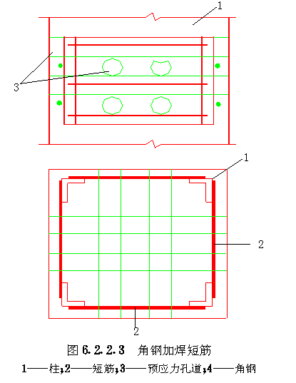 6.2 柱及剪力墙 6.2.1 柱内预留的预应力孔道直径应比预应力束直径大10mm。预应力束直径可采用表6.2.1数值。在计算预应力束实际压折高度时,可考虑预应力束在孔道内的上下偏离及压扁。在采用锥形锚具时,孔道直径不应小于锚环最小内径。 6.2.2 有抗震设防要求时,柱节点核心区箍筋直径及间距可与柱端加密区的箍筋直径及间距相同,且不宜少于3根。当柱节点核心区双向预应力孔道上下紧贴时,可采用以下方式设置箍筋: 6.2.2.1 在纵横孔道贴合面处设置箍筋,箍筋过孔道时微微弯折; 6.2.2.2 设置交叉箍筋(图6.2.2.2); 6.2.2.3 四角设角钢加焊短钢筋(图6.2.2.3),或在四角主筋上加焊短钢筋。 6.2.3 有抗震设防要求时,在板柱节点上下,框架柱除按构造要求加密箍筋外,还可在板底、板面两处设置双层套箍(图6.2.3)。 6.2.4 预制柱上下接头位置宜设在板面以上0.8~1.0m处。 6.2.5 对上下柱的榫式接头,可在完全或部分不浇筑柱接头混凝土,使之接近铰支状态下进行上部楼盖预应力施工。在预应力施工结束后再浇筑柱接头混凝土。 6.2.6 上下层剪力墙之间的竖向钢筋宜穿过明槽伸出板面搭接。