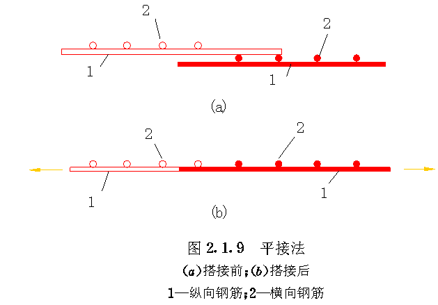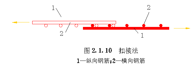 一张网片的钢筋镶入另一张网片,使两张网片的纵向和横向钢筋各自在同一平面内的搭接方法(图2.1.9)。