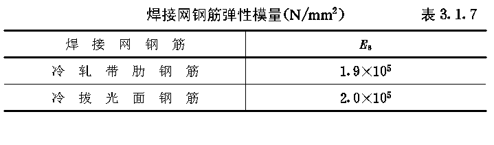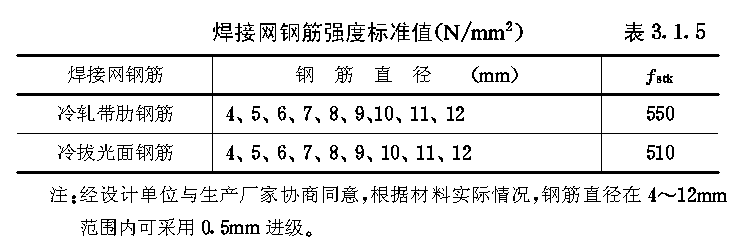3.1 钢筋焊接网 3.1.1 钢筋焊接网宜采用LL550级冷轧带肋钢筋制作,也可采用 LG510级冷拔光面钢筋制作。一片焊接网宜采用同一类型的钢筋焊成。 3.1.2 钢筋焊接网可按形状、规格分为定型焊接网和定制焊接网两种。 3.1.2.1 定型焊接网在两个方向上的钢筋间距和直径可以不同,但在同一个方向上的钢筋应具有相同的直径、间距和长度。 3.1.2.2 定制焊接网的形状、尺寸应根据设计和施工要求,由供需双方协商确定。 3.1.3 钢筋焊接网的规格宜符合下列规定: 3.1.3.1 钢筋直径宜为4~12mm。 3.1.3.2 焊接网长度不宜超过12m,宽度不宜超过3.4m。 3.1.3.3 焊接网制作方向的钢筋间距宜为100、150、200mm,与制作方向垂直的钢筋间距宜为100~400mm,且应为10mm的整倍数。 3.1.4 钢筋焊接网宜用作钢筋混凝土结构构件的受力主筋、构造钢筋以及预应力混凝土结构构件中的非预应力钢筋。 3.1.5 焊接网钢筋的强度标准值fstk应按表3.1.5采用。 3.1.6 焊接网钢筋的抗拉强度设计值fy和抗压强度设计值f''y应按表3.1.6采用。 3.1.7 焊接网钢筋的弹性模量Es应按表3.1.7采用。 表3.1.5 焊接网钢筋强度设计值(N/mm2) 表3.1.6 焊接网钢筋弹性模量(N/mm2) |