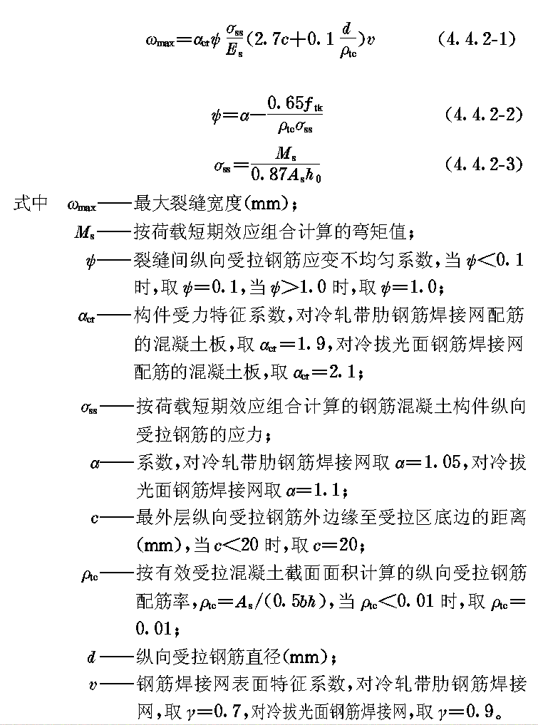 4.4.2 钢筋焊接网配筋的混凝土板类受弯构件,考虑裂缝宽度分布的不均匀性和荷载长期效应组合的影响,其最大裂缝宽度可按下列公式计算: