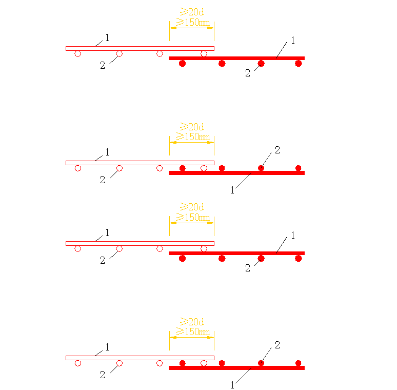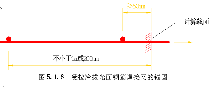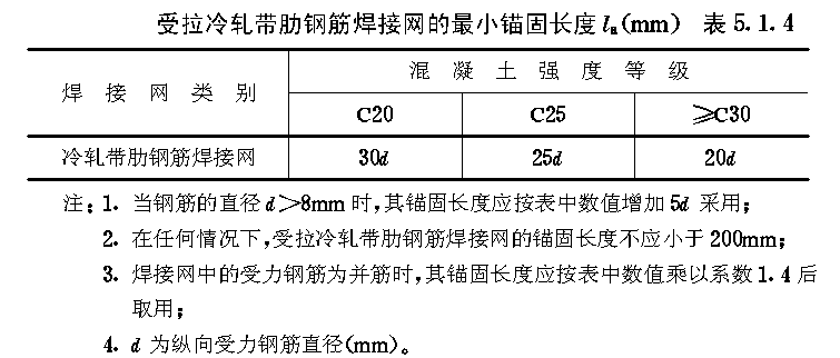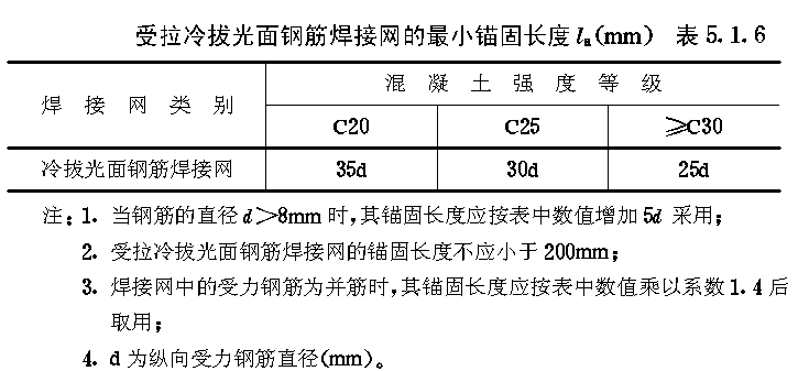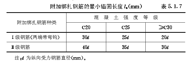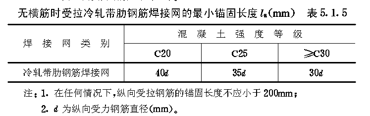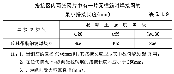 5.1 一般规定 5.1.1 板类构件受力钢筋的混凝土保护层最小厚度(从钢筋的外边缘算起)应符合表5.1.1的规定。 5.1.2 板类构件纵向受力钢筋的配筋率不应小于0.15%。受力钢筋的直径不宜小于5mm,间距不宜大于200mm。 5.1.3 单向板中单位长度上的分布钢筋,其截面面积不应小于单位长度上受力钢筋截面面积的10%,其直径不宜小于5mm,间距不应大于300mm。 5.1.4 对受拉冷轧带肋钢筋焊接网,当在锚固长度范围内至少有一根横向钢筋且此横向钢筋至计算截面的距离不小于50mm时(图5.1.4),其最小锚固长度不应小于表5.1.4规定的数值。 5.1.5 当在锚固长度内无横向钢筋时,受拉冷轧带肋钢筋焊接网的最小锚固长度不应小于表5.1.5规定的数值。 图5.1.4受拉冷轧带肋钢筋焊接网的锚固 受拉冷轧带肋钢筋焊接网的最小锚固长度la(mm) 表5.1.4 无横筋时受拉冷轧带肋钢筋焊接网的最小锚固长度la(mm) 5.1.6 对受拉冷拔光面钢筋焊接网,当在锚固长度范围内有不少于两根横向钢筋且较近一根横向钢筋至计算截面的距离不小于50mm(图5.1.6)时,其最小锚固长度不应小于表5.1.6规定的数值。 图5.1.6受拉冷拔光面钢筋焊接网的锚固 受拉冷拔光面钢筋焊接网的最小锚固长度la(mm) 5.1.7 钢筋焊接网受拉钢筋的附加绑扎钢筋的最小锚固长度不应小于表5.1.7规定的数值。 5.1.8 钢筋焊接网的搭接接头应设置在受力较小处。 5.1.9 当计算中充分利用钢筋的抗拉强度时,冷轧带肋钢筋焊接网在受拉方向的搭接接头可采用叠接法(或扣接法),并应符合下列规定: 5.1.9.1 两片钢筋焊接网末端之间钢筋搭接接头的最小搭接 长度,不应小于本规程第5.1.4条规定的最小锚固长度la的1.2倍(图5.1.9),且不应小于200mm;在搭接区内每张焊接网片的横向钢筋不得少于一根,两网片最外一根横向钢筋之间搭接长度不应小于50mm。 图5.1.9冷轧带肋钢筋焊接网搭接接头 5.1.10 当计算中充分利用钢筋的抗拉强度时,冷拔光面钢筋焊接网在受拉方向的搭接接头可采用叠接法(或扣接法),并应符合下列规定: 5.1.10.1 在搭接长度范围内每张网片的横向钢筋不应少于二根,两片焊接网最外边横向钢筋间的搭接长度不应少于一个网格(图5.1.10),也不应小于本规程第5.1.6条规定的最小锚固长度la的1.2倍,且不应小于250mm。 5.1.10.2 冷拔光面钢筋焊接网的受力钢筋,当搭接区内一张网片无横向钢筋且无附加钢筋、网片或附加锚固构造措施时,不得采用搭接。 5.1.11 当钢筋焊接网采用扣接法搭接时,其搭接长度应与叠接法的有关规定相同。 5.1.12 钢筋焊接网在受压方向的搭接长度,应取受拉钢筋搭接长度的0.7倍。 5.1.13 钢筋焊接网在非受力方向的分布钢筋的搭接,当采用叠接法(图5.1.13a)或扣接法(图5.1.13b)时,每个网片在搭接范围内至少应有一根受力主筋,搭接长度不应小于20d(d为分布钢筋直径)且不应小于150mm。 (a)叠接法; (b)扣接法; (c)平接法 1—分布钢筋; 2—受力钢筋 钢筋焊接网在非受力方向的分布钢筋,当采用平接法搭接且一张网片在搭接区内无受力钢筋时,其搭接长度应符合下列规定(图5.1.13c): 对冷轧带肋钢筋焊接网不应小于20d且不应小于200mm; 对冷拔光面钢筋焊接网不应小于25d且不应小于250mm。 5.1.14 钢筋焊接网在受力方向也可采用Ⅰ级或Ⅱ级热轧钢筋现场绑扎搭接,搭接钢筋的截面面积可按等强度设计原则换算求得。 受拉钢筋的搭接长度不应小于1.2la,且不应小于300mm;受压钢筋的搭接长度不应小于0.85la,且不应小于200mm。 5.1.15 考虑地震作用组合的钢筋混凝土结构构件, 对一、二级抗震等级,焊接网受拉钢筋的最小锚固长度和搭接长度均应增加附加锚固长度5d; 对三、四级抗震等级,可不考虑。 |