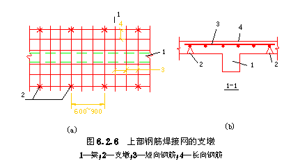 6.2.1 钢筋焊接网运输时应捆扎整齐、牢固,每捆重量不应超过2t,必要时应加刚性支撑或支架。 6.2.2 进场的钢筋焊接网宜按施工要求堆放,并应有明显的标志。 6.2.3 附加钢筋宜在现场绑扎,并应符合现行国家标准《混凝土结构工程施工及验收规范》GB50204的有关规定。 6.2.4 对两端须插入梁内锚固的焊接网,当网片纵向钢筋较细时,可利用网片的弯曲变形性能,先将焊接网中部向上弯曲,使两端能先后插入梁内,然后铺平网片;当钢筋较粗焊接网不能弯曲时,可将焊接网的一端少焊1~2根横向钢筋,先插入该端,然后退插另一端,必要时可采用绑扎方法补回所减少的横向钢筋。 6.2.5 钢筋焊接网的搭接、构造,应符合本规程第5.1节至第5.3节的规定。两张网片搭接时,在搭接区中心及两端应采用铁丝绑扎牢固。在附加钢筋与焊接网连接的每个节点处均应采用铁丝绑扎。 6.2.6 钢筋焊接网安装时,下部网片应设置与保护层厚度相当的水泥砂浆垫块或塑料卡;板的上部网片应在短向钢筋两端,沿长向钢筋方向每隔600~900mm设一钢筋支墩(图6.2.6)。 6.2.7 钢筋焊接网长度和宽度的允许偏差为±25mm,其他安装允许偏差应符合现行国家标准《混凝土结构工程施工及验收规范》GB50204的规定。 |