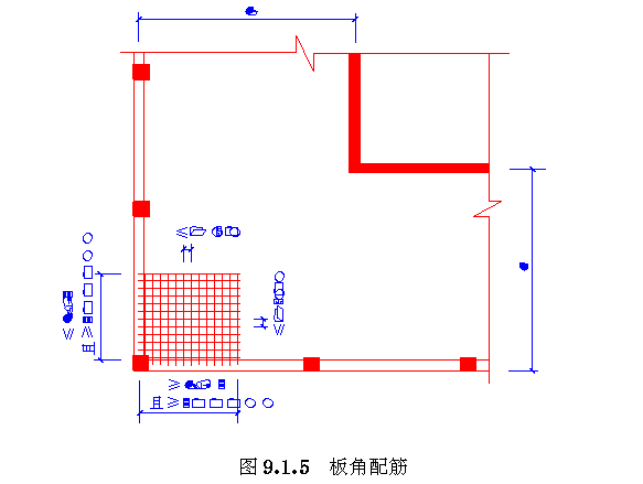 9.1.5 筒体结构的楼盖外角宜设置双层双向钢筋( 图9.1.5 ),单层单向配筋率不宜小于0.3%,钢筋的直径不应小于8mm,间距不应大于150mm,配筋范围不宜小于外框架(或外筒)至内筒外墙中距的1/3和3m。